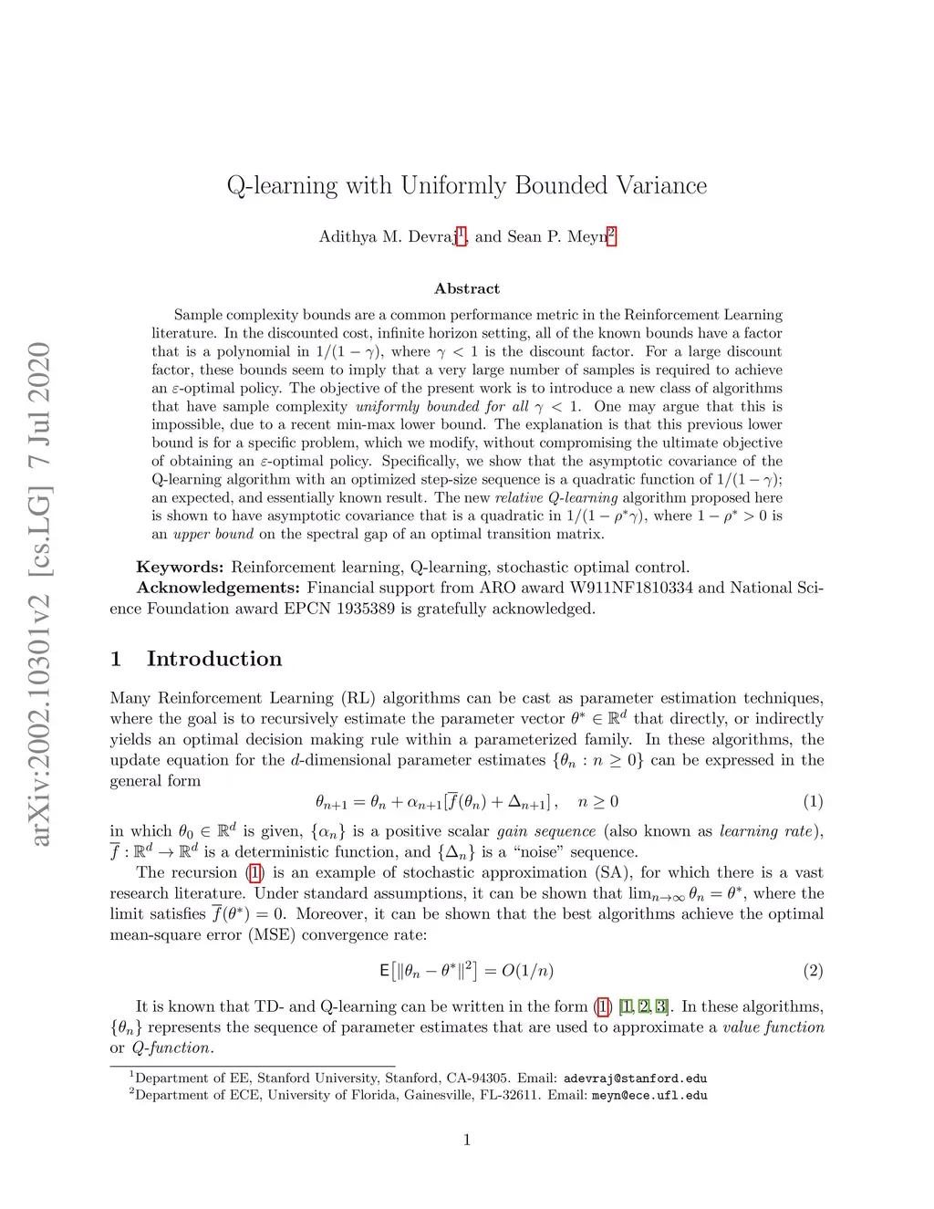 Sample complexity bounds are a common performance metric in the Reinforcement Learning literature. In the discounted cost, infinite horizon setting, all of the known bounds have a factor that is a polynomial in , where is the discount factor. For a large discount factor, these bounds seem to imply that a very large number of samples is required to achieve an -optimal policy. The objective of the present work is to introduce a new class of algorithms that have sample complexity uniformly bounded for all . One may argue that this is impossible, due to a recent min-max lower bound. The explanation is that this previous lower bound is for a specific problem, which we modify, without compromising the ultimate objective of obtaining an -optimal policy. Specifically, we show that the asymptotic covariance of the Q-learning algorithm with an optimized step-size sequence is a quadratic function of ; an expected, and essentially known result. The new relative Q-learning algorithm proposed here is shown to have asymptotic covariance that is a quadratic in , where is an upper bound on the spectral gap of an optimal transition matrix.