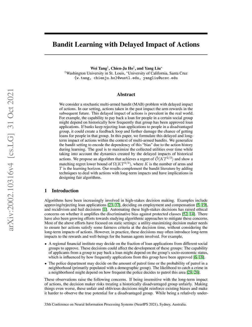 We consider a stochastic multi-armed bandit (MAB) problem with delayed impact of actions. In our setting, actions taken in the past impact the arm rewards in the subsequent future. This delayed impact of actions is prevalent in the real world. For example, the capability to pay back a loan for people in a certain social group might depend on historically how frequently that group has been approved loan applications. If banks keep rejecting loan applications to people in a disadvantaged group, it could create a feedback loop and further damage the chance of getting loans for people in that group. In this paper, we formulate this delayed and long-term impact of actions within the context of multi-armed bandits. We generalize the bandit setting to encode the dependency of this "bias" due to the action history during learning. The goal is to maximize the collected utilities over time while taking into account the dynamics created by the delayed impacts of historical actions. We propose an algorithm that achieves a regret of and show a matching regret lower bound of , where is the number of arms and is the learning horizon. Our results complement the bandit literature by adding techniques to deal with actions with long-term impacts and have implications in designing fair algorithms.