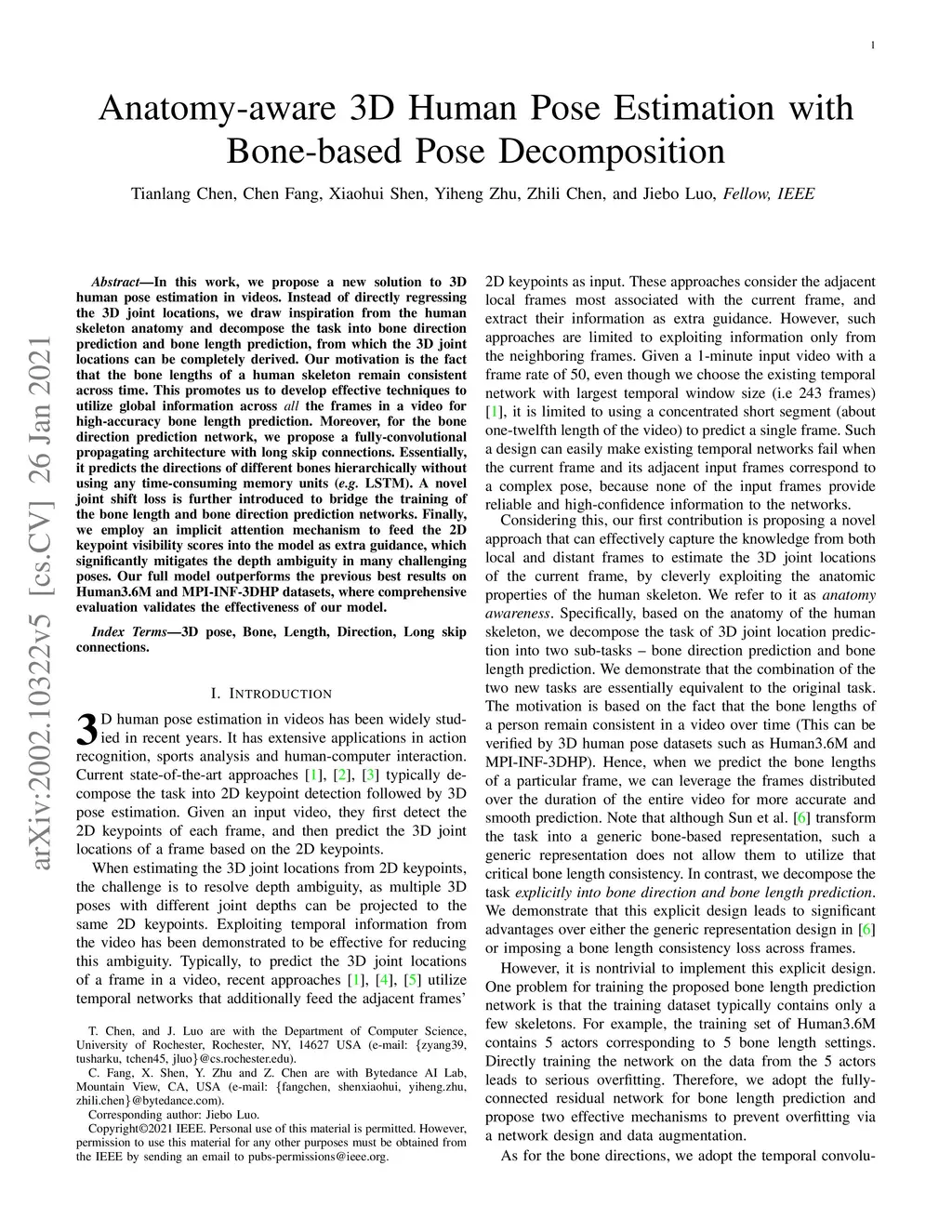 In this work, we propose a new solution to 3D human pose estimation in videos. Instead of directly regressing the 3D joint locations, we draw inspiration from the human skeleton anatomy and decompose the task into bone direction prediction and bone length prediction, from which the 3D joint locations can be completely derived. Our motivation is the fact that the bone lengths of a human skeleton remain consistent across time. This promotes us to develop effective techniques to utilize global information across all the frames in a video for high-accuracy bone length prediction. Moreover, for the bone direction prediction network, we propose a fully-convolutional propagating architecture with long skip connections. Essentially, it predicts the directions of different bones hierarchically without using any time-consuming memory units e.g. LSTM). A novel joint shift loss is further introduced to bridge the training of the bone length and bone direction prediction networks. Finally, we employ an implicit attention mechanism to feed the 2D keypoint visibility scores into the model as extra guidance, which significantly mitigates the depth ambiguity in many challenging poses. Our full model outperforms the previous best results on Human3.6M and MPI-INF-3DHP datasets, where comprehensive evaluation validates the effectiveness of our model.