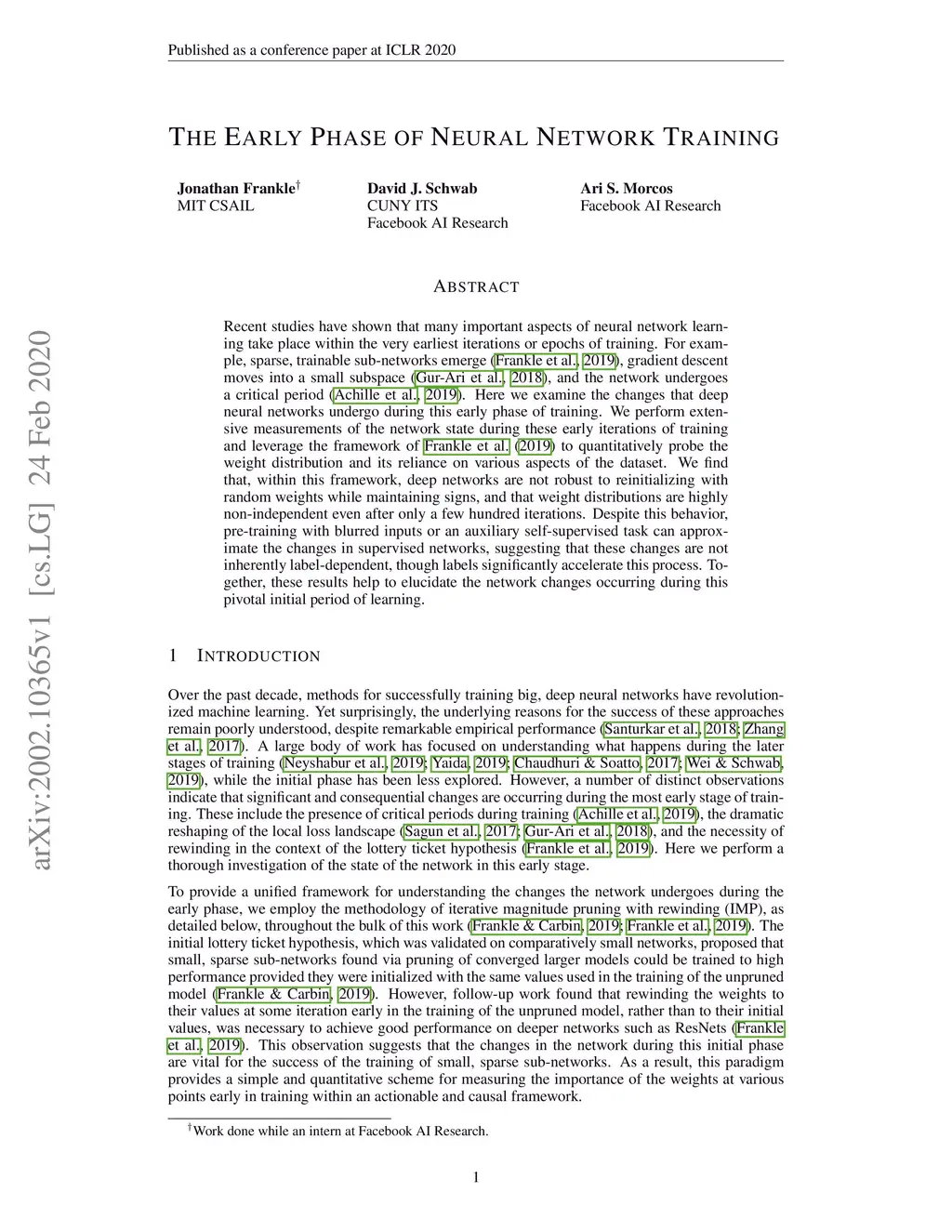 Recent studies have shown that many important aspects of neural network learning take place within the very earliest iterations or epochs of training. For example, sparse, trainable sub-networks emerge (Frankle et al., 2019), gradient descent moves into a small subspace (Gur-Ari et al., 2018), and the network undergoes a critical period (Achille et al., 2019). Here, we examine the changes that deep neural networks undergo during this early phase of training. We perform extensive measurements of the network state during these early iterations of training and leverage the framework of Frankle et al. (2019) to quantitatively probe the weight distribution and its reliance on various aspects of the dataset. We find that, within this framework, deep networks are not robust to reinitializing with random weights while maintaining signs, and that weight distributions are highly non-independent even after only a few hundred iterations. Despite this behavior, pre-training with blurred inputs or an auxiliary self-supervised task can approximate the changes in supervised networks, suggesting that these changes are not inherently label-dependent, though labels significantly accelerate this process. Together, these results help to elucidate the network changes occurring during this pivotal initial period of learning.