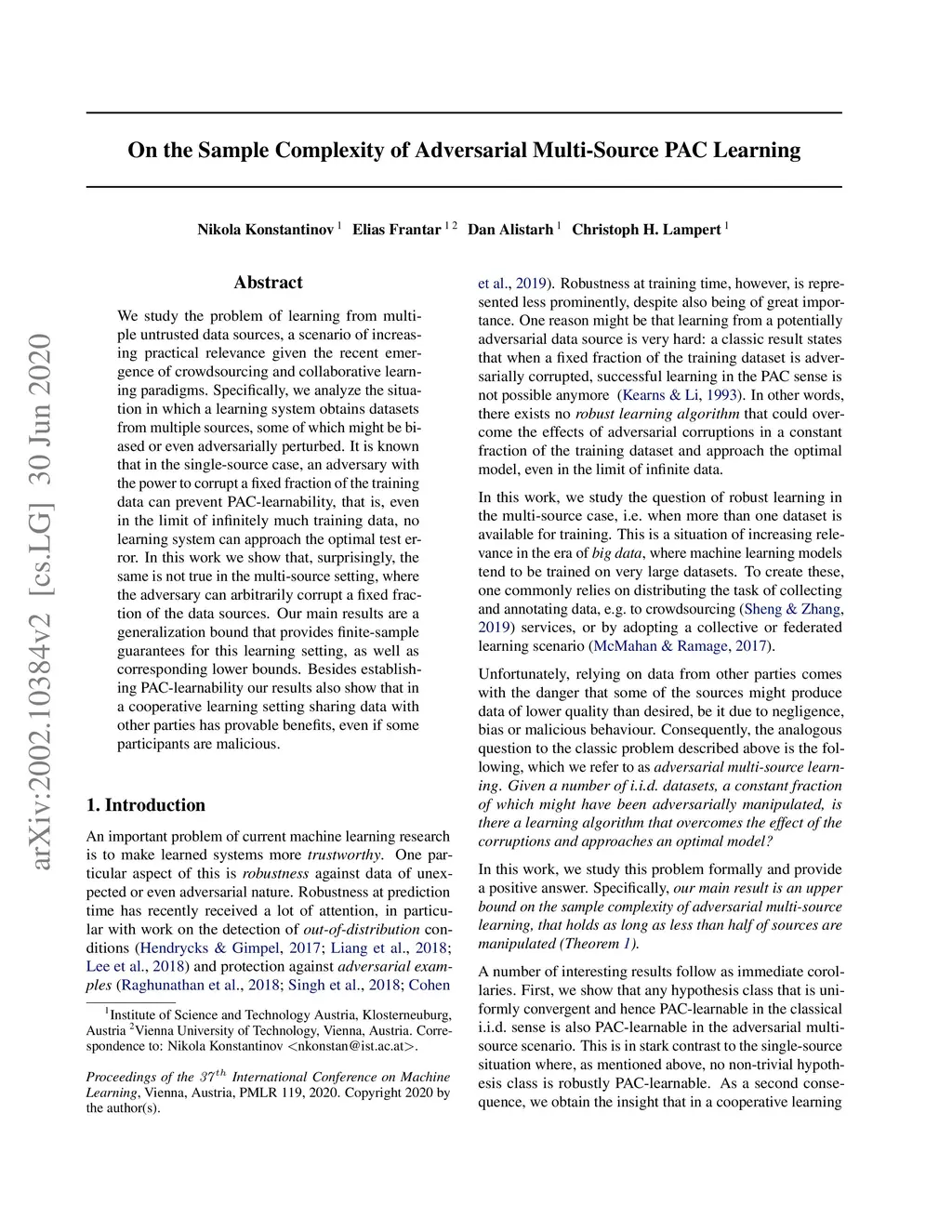 On the Sample Complexity of Adversarial Multi-Source PAC Learning