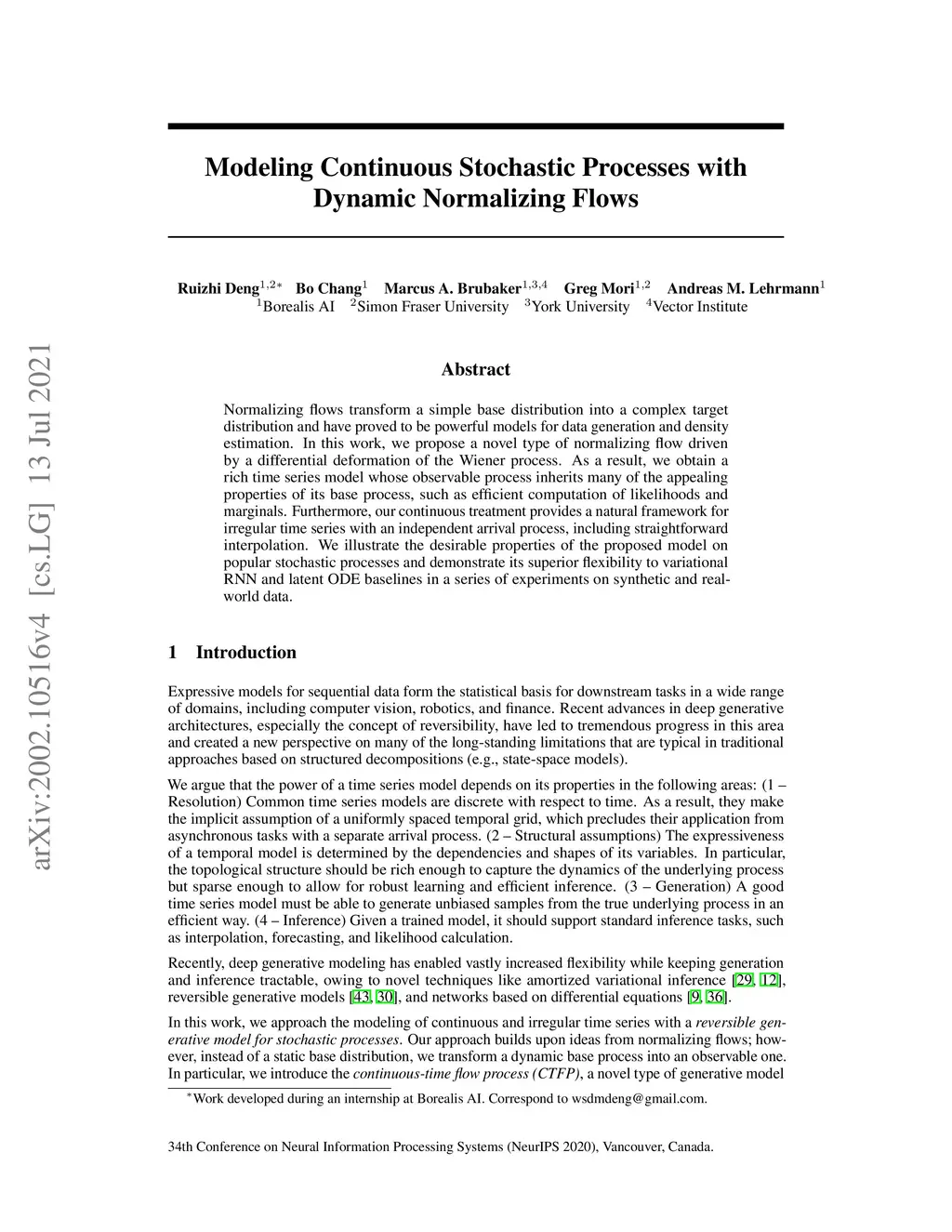 Normalizing flows transform a simple base distribution into a complex target distribution and have proved to be powerful models for data generation and density estimation. In this work, we propose a novel type of normalizing flow driven by a differential deformation of the Wiener process. As a result, we obtain a rich time series model whose observable process inherits many of the appealing properties of its base process, such as efficient computation of likelihoods and marginals. Furthermore, our continuous treatment provides a natural framework for irregular time series with an independent arrival process, including straightforward interpolation. We illustrate the desirable properties of the proposed model on popular stochastic processes and demonstrate its superior flexibility to variational RNN and latent ODE baselines in a series of experiments on synthetic and real-world data.