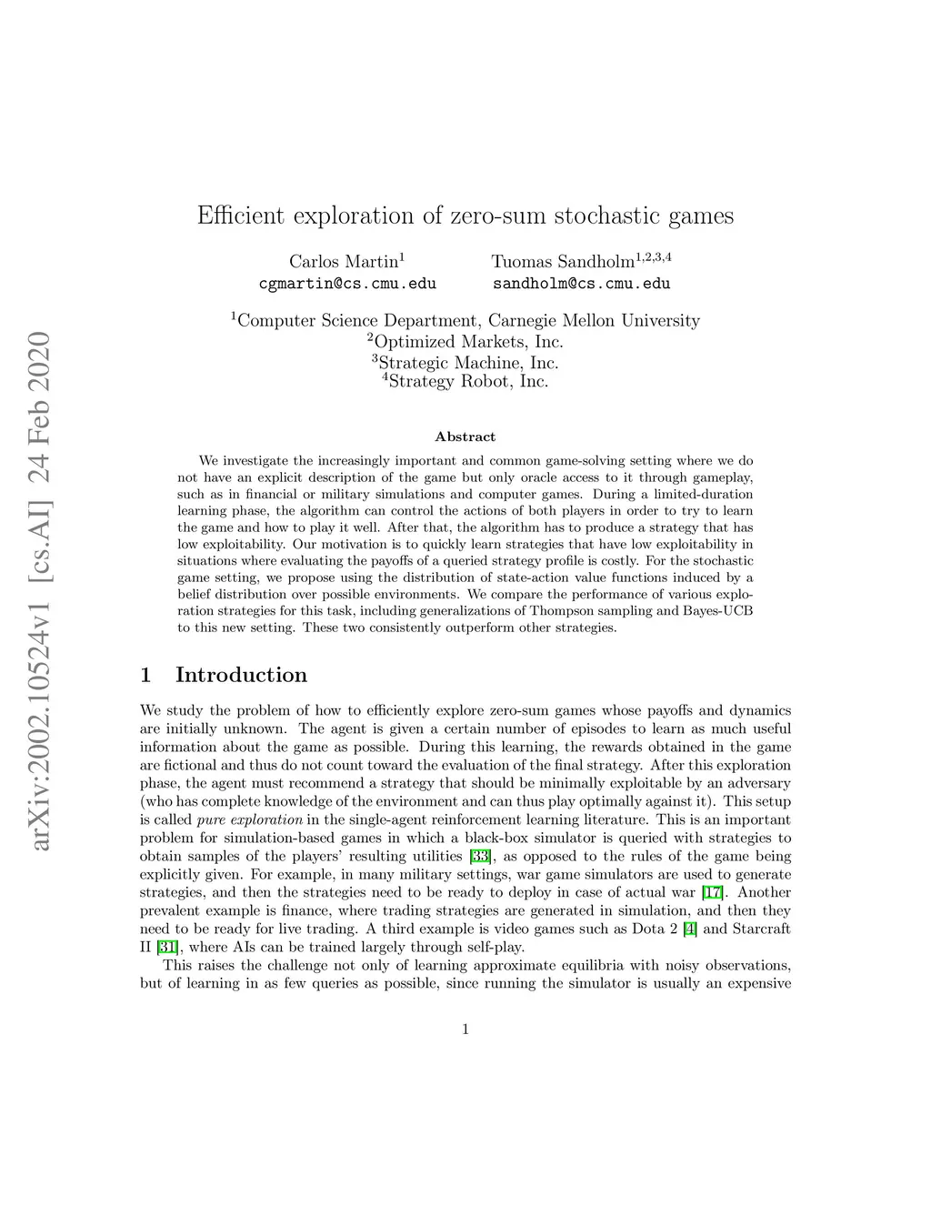 We investigate the increasingly important and common game-solving setting where we do not have an explicit description of the game but only oracle access to it through gameplay, such as in financial or military simulations and computer games. During a limited-duration learning phase, the algorithm can control the actions of both players in order to try to learn the game and how to play it well. After that, the algorithm has to produce a strategy that has low exploitability. Our motivation is to quickly learn strategies that have low exploitability in situations where evaluating the payoffs of a queried strategy profile is costly. For the stochastic game setting, we propose using the distribution of state-action value functions induced by a belief distribution over possible environments. We compare the performance of various exploration strategies for this task, including generalizations of Thompson sampling and Bayes-UCB to this new setting. These two consistently outperform other strategies.