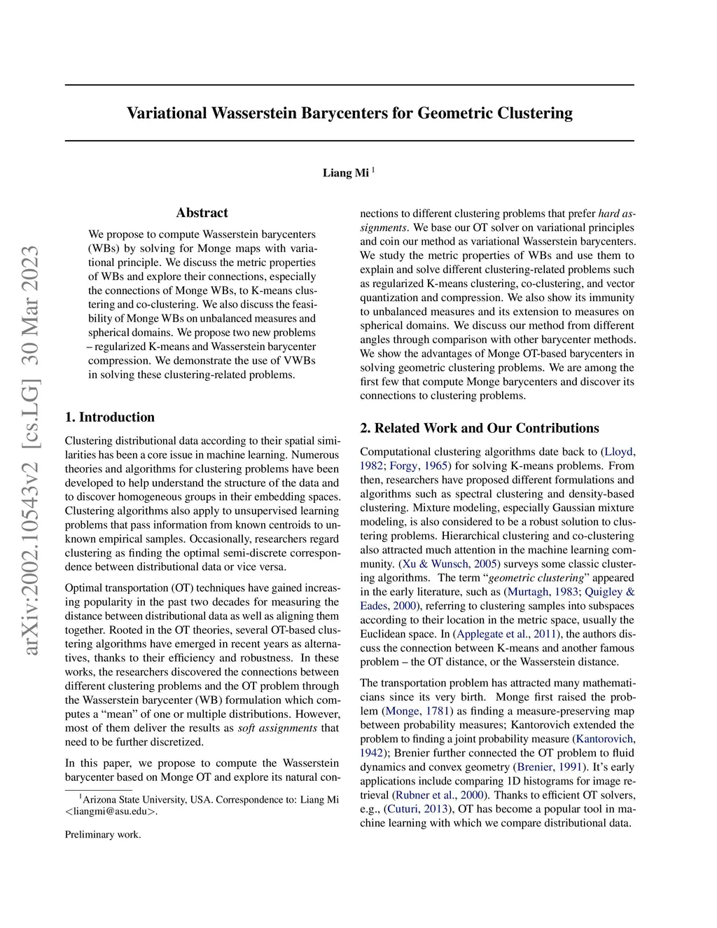 We propose to compute Wasserstein barycenters (WBs) by solving for Monge maps with variational principle. We discuss the metric properties of WBs and explore their connections, especially the connections of Monge WBs, to K-means clustering and co-clustering. We also discuss the feasibility of Monge WBs on unbalanced measures and spherical domains. We propose two new problems -- regularized K-means and Wasserstein barycenter compression. We demonstrate the use of VWBs in solving these clustering-related problems.