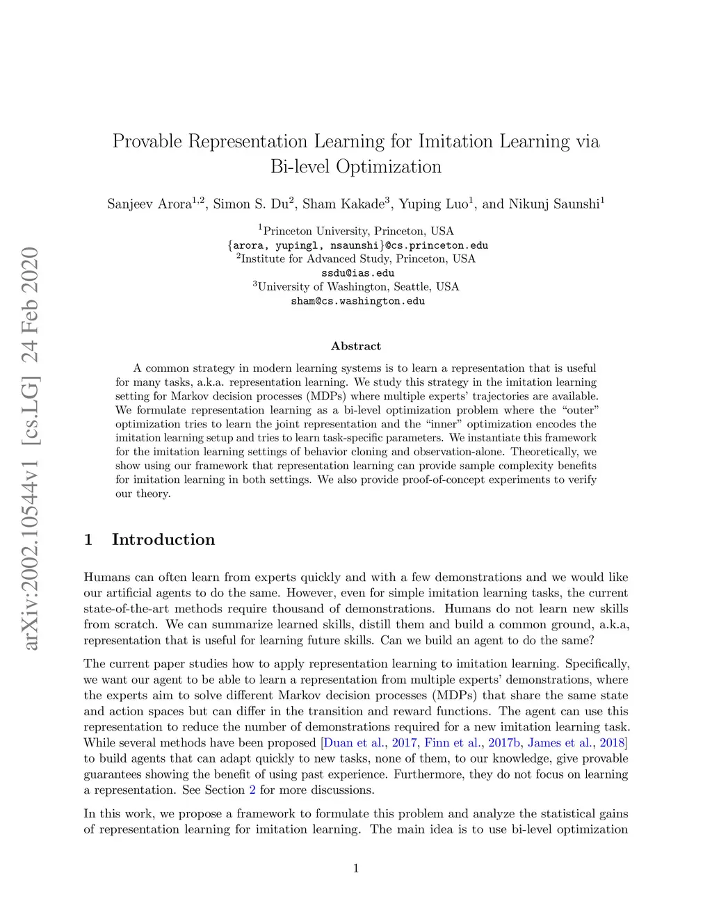 A common strategy in modern learning systems is to learn a representation that is useful for many tasks, a.k.a. representation learning. We study this strategy in the imitation learning setting for Markov decision processes (MDPs) where multiple experts' trajectories are available. We formulate representation learning as a bi-level optimization problem where the "outer" optimization tries to learn the joint representation and the "inner" optimization encodes the imitation learning setup and tries to learn task-specific parameters. We instantiate this framework for the imitation learning settings of behavior cloning and observation-alone. Theoretically, we show using our framework that representation learning can provide sample complexity benefits for imitation learning in both settings. We also provide proof-of-concept experiments to verify our theory.