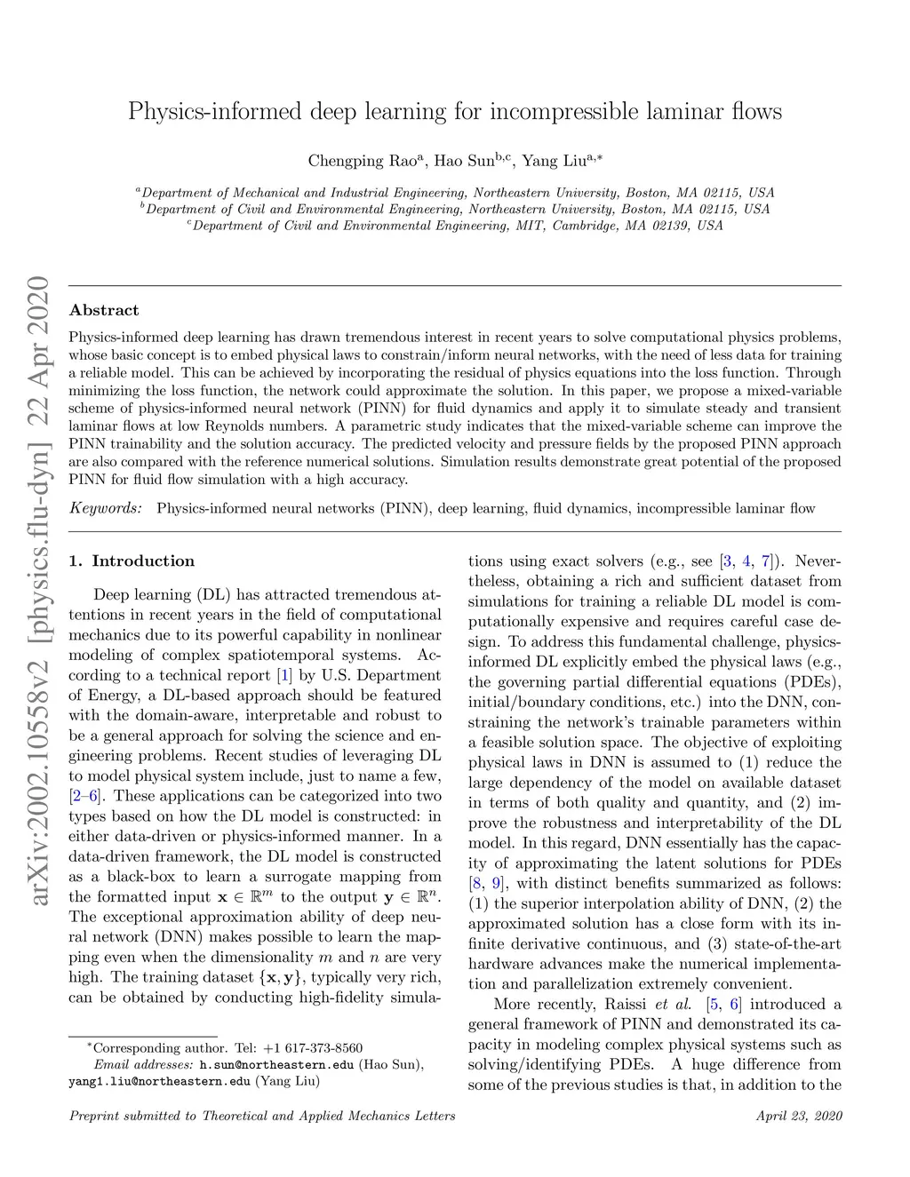 Physics-informed deep learning has drawn tremendous interest in recent years to solve computational physics problems, whose basic concept is to embed physical laws to constrain/inform neural networks, with the need of less data for training a reliable model. This can be achieved by incorporating the residual of physics equations into the loss function. Through minimizing the loss function, the network could approximate the solution. In this paper, we propose a mixed-variable scheme of physics-informed neural network (PINN) for fluid dynamics and apply it to simulate steady and transient laminar flows at low Reynolds numbers. A parametric study indicates that the mixed-variable scheme can improve the PINN trainability and the solution accuracy. The predicted velocity and pressure fields by the proposed PINN approach are also compared with the reference numerical solutions. Simulation results demonstrate great potential of the proposed PINN for fluid flow simulation with a high accuracy.