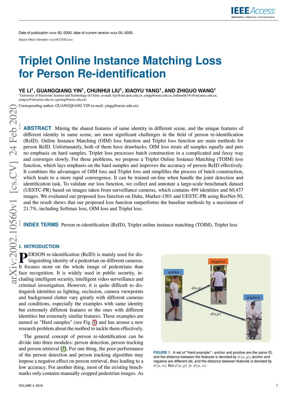 Mining the shared features of same identity in different scene, and the unique features of different identity in same scene, are most significant challenges in the field of person re-identification (ReID). Online Instance Matching (OIM) loss function and Triplet loss function are main methods for person ReID. Unfortunately, both of them have drawbacks. OIM loss treats all samples equally and puts no emphasis on hard samples. Triplet loss processes batch construction in a complicated and fussy way and converges slowly. For these problems, we propose a Triplet Online Instance Matching (TOIM) loss function, which lays emphasis on the hard samples and improves the accuracy of person ReID effectively. It combines the advantages of OIM loss and Triplet loss and simplifies the process of batch construction, which leads to a more rapid convergence. It can be trained on-line when handle the joint detection and identification task. To validate our loss function, we collect and annotate a large-scale benchmark dataset (UESTC-PR) based on images taken from surveillance cameras, which contains 499 identities and 60,437 images. We evaluated our proposed loss function on Duke, Marker-1501 and UESTC-PR using ResNet-50, and the result shows that our proposed loss function outperforms the baseline methods by a maximum of 21.7%, including Softmax loss, OIM loss and Triplet loss.