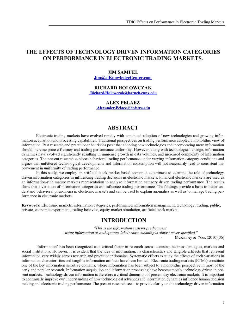 Electronic trading markets have evolved rapidly with continued adoption of new technologies and growing in-formation acquisition and processing capabilities. Traditional perspectives on trading performance adopted a mono-lithic view of information. Past research and practitioner heuristics posit that adopting new technologies and incorpo-rating more information should increase price efficiency and trading performance uniformity. However, along with technological change, information dynamics have evolved significantly resulting in immense growth in data volumes, and increased complexity of information categories. The present research explores behavioral trading performance under varying information category conditions and argues that unfettered technological developments and information consumption will not necessarily lead to consistent improvement in uniformity of trading performance. In this study, we employ an artificial stock market based economic experiment to examine the role of technol-ogy driven information categories in influencing trading decisions in electronic markets. Financial electronic markets are used as an information-rich mature markets representation to analyze information category driven trading perfor-mance. The results show that a variation of information categories can influence trading performance. The findings provide a basis to better understand behavioral phenomena in electronic markets and can be used to explain anomalies as well as to manage trading performance in electronic markets.