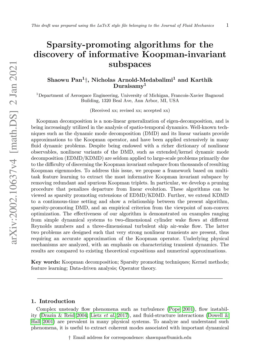 Koopman decomposition is a non-linear generalization of eigen decomposition, and is being increasingly utilized in the analysis of spatio-temporal dynamics. Well-known techniques such as the dynamic mode decomposition (DMD) and its variants provide approximations to the Koopman operator, and have been applied extensively in many fluid dynamic problems. Despite being endowed with a richer dictionary of nonlinear observables, nonlinear variants of the DMD, such as extended/kernel dynamic mode decomposition (EDMD/KDMD) are seldom applied to large-scale problems primarily due to the difficulty of discerning the Koopman invariant subspace from thousands of resulting Koopman triplets: eigenvalues, eigenvectors, and modes. To address this issue, we revisit the formulation of EDMD and KDMD, and propose an algorithm based on multi-task feature learning to extract the most informative Koopman invariant subspace by removing redundant and spurious Koopman triplets. These algorithms can be viewed as sparsity promoting extensions of EDMD/KDMD and are presented in an open-source package. Further, we extend KDMD to a continuous-time setting and show a relationship between the present algorithm, sparsity-promoting DMD and an empirical criterion from the viewpoint of non-convex optimization. The effectiveness of our algorithm is demonstrated on examples ranging from simple dynamical systems to two-dimensional cylinder wake flows at different Reynolds numbers and a three-dimensional turbulent ship air-wake flow. The latter two problems are designed such that very strong nonlinear transients are present in the flow evolution, thus requiring accurate approximation of the Koopman operator. Underlying physical mechanisms are analyzed and the results are compared to existing theoretical expositions and numerical approximations.