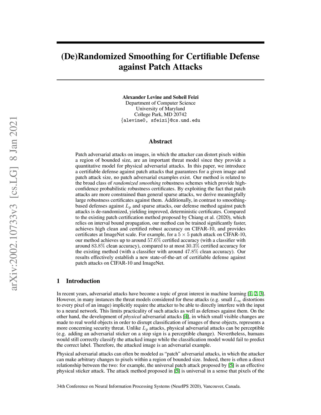 Patch adversarial attacks on images, in which the attacker can distort pixels within a region of bounded size, are an important threat model since they provide a quantitative model for physical adversarial attacks. In this paper, we introduce a certifiable defense against patch attacks that guarantees for a given image and patch attack size, no patch adversarial examples exist. Our method is related to the broad class of randomized smoothing robustness schemes which provide high-confidence probabilistic robustness certificates. By exploiting the fact that patch attacks are more constrained than general sparse attacks, we derive meaningfully large robustness certificates against them. Additionally, in contrast to smoothing-based defenses against L_p and sparse attacks, our defense method against patch attacks is de-randomized, yielding improved, deterministic certificates. Compared to the existing patch certification method proposed by Chiang et al. (2020), which relies on interval bound propagation, our method can be trained significantly faster, achieves high clean and certified robust accuracy on CIFAR-10, and provides certificates at ImageNet scale. For example, for a 5-by-5 patch attack on CIFAR-10, our method achieves up to around 57.6% certified accuracy (with a classifier with around 83.8% clean accuracy), compared to at most 30.3% certified accuracy for the existing method (with a classifier with around 47.8% clean accuracy). Our results effectively establish a new state-of-the-art of certifiable defense against patch attacks on CIFAR-10 and ImageNet. Code is available at https://github.com/alevine0/patchSmoothing.