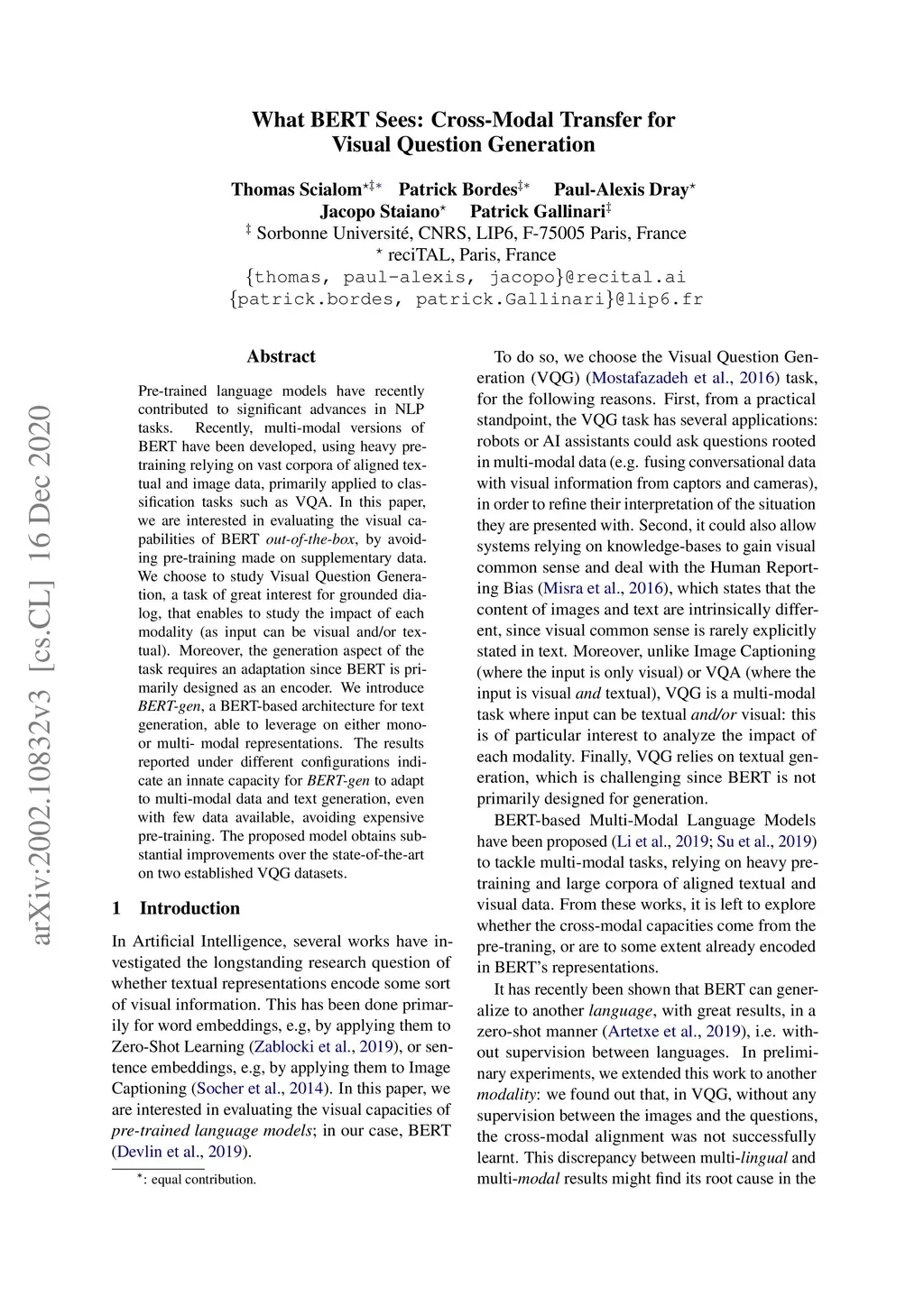 Pre-trained language models have recently contributed to significant advances in NLP tasks. Recently, multi-modal versions of BERT have been developed, using heavy pre-training relying on vast corpora of aligned textual and image data, primarily applied to classification tasks such as VQA. In this paper, we are interested in evaluating the visual capabilities of BERT out-of-the-box, by avoiding pre-training made on supplementary data. We choose to study Visual Question Generation, a task of great interest for grounded dialog, that enables to study the impact of each modality (as input can be visual and/or textual). Moreover, the generation aspect of the task requires an adaptation since BERT is primarily designed as an encoder. We introduce BERT-gen, a BERT-based architecture for text generation, able to leverage on either mono- or multi- modal representations. The results reported under different configurations indicate an innate capacity for BERT-gen to adapt to multi-modal data and text generation, even with few data available, avoiding expensive pre-training. The proposed model obtains substantial improvements over the state-of-the-art on two established VQG datasets.