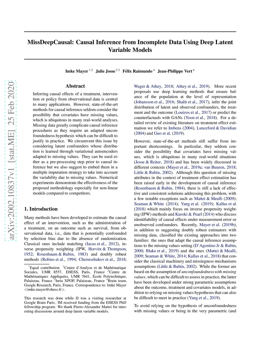 Inferring causal effects of a treatment, intervention or policy from observational data is central to many applications. However, state-of-the-art methods for causal inference seldom consider the possibility that covariates have missing values, which is ubiquitous in many real-world analyses. Missing data greatly complicate causal inference procedures as they require an adapted unconfoundedness hypothesis which can be difficult to justify in practice. We circumvent this issue by considering latent confounders whose distribution is learned through variational autoencoders adapted to missing values. They can be used either as a pre-processing step prior to causal inference but we also suggest to embed them in a multiple imputation strategy to take into account the variability due to missing values. Numerical experiments demonstrate the effectiveness of the proposed methodology especially for non-linear models compared to competitors.