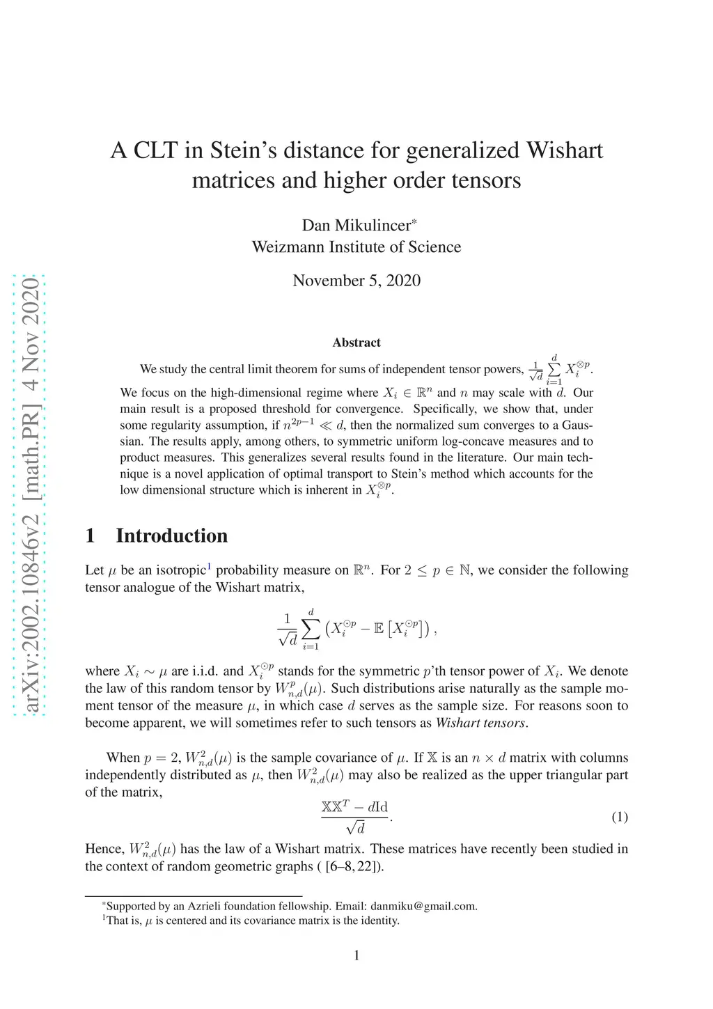 We study the central limit theorem for sums of independent tensor powers, . We focus on the high-dimensional regime where and may scale with . Our main result is a proposed threshold for convergence. Specifically, we show that, under some regularity assumption, if , then the normalized sum converges to a Gaussian. The results apply, among others, to symmetric uniform log-concave measures and to product measures. This generalizes several results found in the literature. Our main technique is a novel application of optimal transport to Stein's method which accounts for the low dimensional structure which is inherent in .
