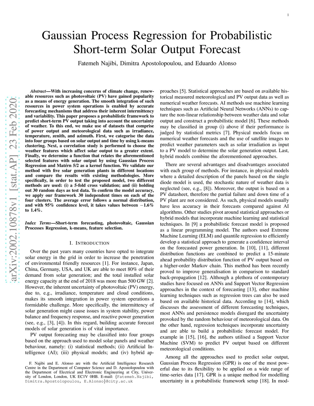 With increasing concerns of climate change, renewable resources such as photovoltaic (PV) have gained popularity as a means of energy generation. The smooth integration of such resources in power system operations is enabled by accurate forecasting mechanisms that address their inherent intermittency and variability. This paper proposes a probabilistic framework to predict short-term PV output taking into account the uncertainty of weather. To this end, we make use of datasets that comprise of power output and meteorological data such as irradiance, temperature, zenith, and azimuth. First, we categorise the data into four groups based on solar output and time by using k-means clustering. Next, a correlation study is performed to choose the weather features which affect solar output to a greater extent. Finally, we determine a function that relates the aforementioned selected features with solar output by using Gaussian Process Regression and Matern 5/2 as a kernel function. We validate our method with five solar generation plants in different locations and compare the results with existing methodologies. More specifically, in order to test the proposed model, two different methods are used: (i) 5-fold cross-validation; and (ii) holding out 30 random days as test data. To confirm the model accuracy, we apply our framework 30 independent times on each of the four clusters. The average error follows a normal distribution, and with 95% confidence level, it takes values between -1.6% to 1.4%.
