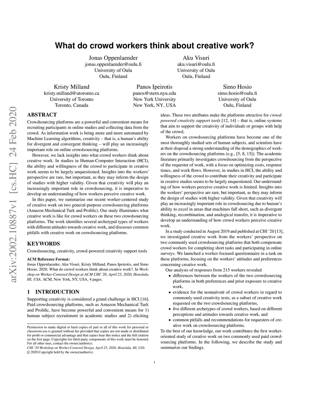 Crowdsourcing platforms are a powerful and convenient means for recruiting participants in online studies and collecting data from the crowd. As information work is being more and more automated by Machine Learning algorithms, creativity that is, a human's ability for divergent and convergent thinking will play an increasingly important role on online crowdsourcing platforms. However, we lack insights into what crowd workers think about creative work. In studies in Human-Computer Interaction (HCI), the ability and willingness of the crowd to participate in creative work seems to be largely unquestioned. Insights into the workers' perspective are rare, but important, as they may inform the design of studies with higher validity. Given that creativity will play an increasingly important role in crowdsourcing, it is imperative to develop an understanding of how workers perceive creative work. In this paper, we summarize our recent worker-centered study of creative work on two general-purpose crowdsourcing platforms (Amazon Mechanical Turk and Prolific). Our study illuminates what creative work is like for crowd workers on these two crowdsourcing platforms. The work identifies several archetypal types of workers with different attitudes towards creative work, and discusses common pitfalls with creative work on crowdsourcing platforms.