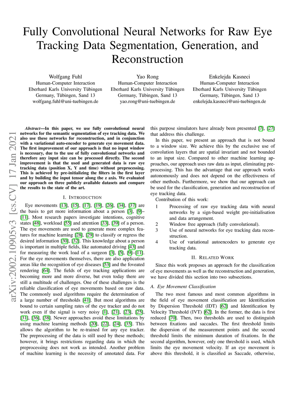 In this paper, we use fully convolutional neural networks for the semantic segmentation of eye tracking data. We also use these networks for reconstruction, and in conjunction with a variational auto-encoder to generate eye movement data. The first improvement of our approach is that no input window is necessary, due to the use of fully convolutional networks and therefore any input size can be processed directly. The second improvement is that the used and generated data is raw eye tracking data (position X, Y and time) without preprocessing. This is achieved by pre-initializing the filters in the first layer and by building the input tensor along the z axis. We evaluated our approach on three publicly available datasets and compare the results to the state of the art.