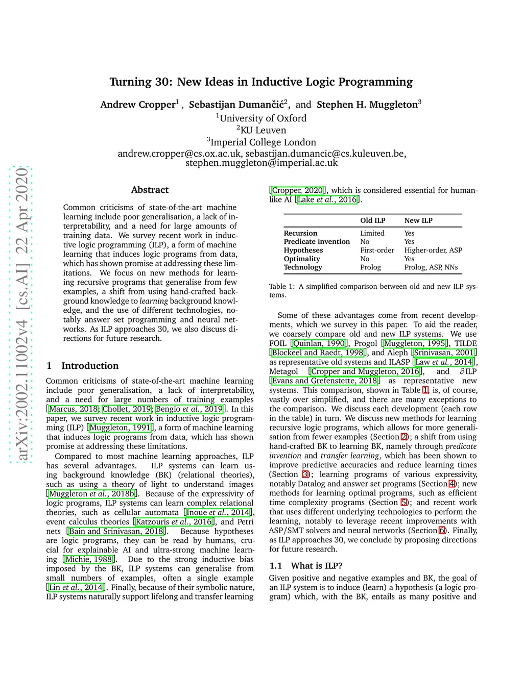 Common criticisms of state-of-the-art machine learning include poor generalisation, a lack of interpretability, and a need for large amounts of training data. We survey recent work in inductive logic programming (ILP), a form of machine learning that induces logic programs from data, which has shown promise at addressing these limitations. We focus on new methods for learning recursive programs that generalise from few examples, a shift from using hand-crafted background knowledge to \emph{learning} background knowledge, and the use of different technologies, notably answer set programming and neural networks. As ILP approaches 30, we also discuss directions for future research.