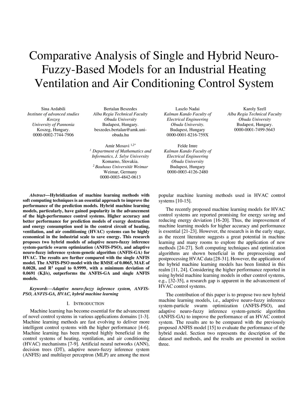Hybridization of machine learning methods with soft computing techniques is an essential approach to improve the performance of the prediction models. Hybrid machine learning models, particularly, have gained popularity in the advancement of the high-performance control systems. Higher accuracy and better performance for prediction models of exergy destruction and energy consumption used in the control circuit of heating, ventilation, and air conditioning (HVAC) systems can be highly economical in the industrial scale to save energy. This research proposes two hybrid models of adaptive neuro-fuzzy inference system-particle swarm optimization (ANFIS-PSO), and adaptive neuro-fuzzy inference system-genetic algorithm (ANFIS-GA) for HVAC. The results are further compared with the single ANFIS model. The ANFIS-PSO model with the RMSE of 0.0065, MAE of 0.0028, and R2 equal to 0.9999, with a minimum deviation of 0.0691 (KJ/s), outperforms the ANFIS-GA and single ANFIS models.