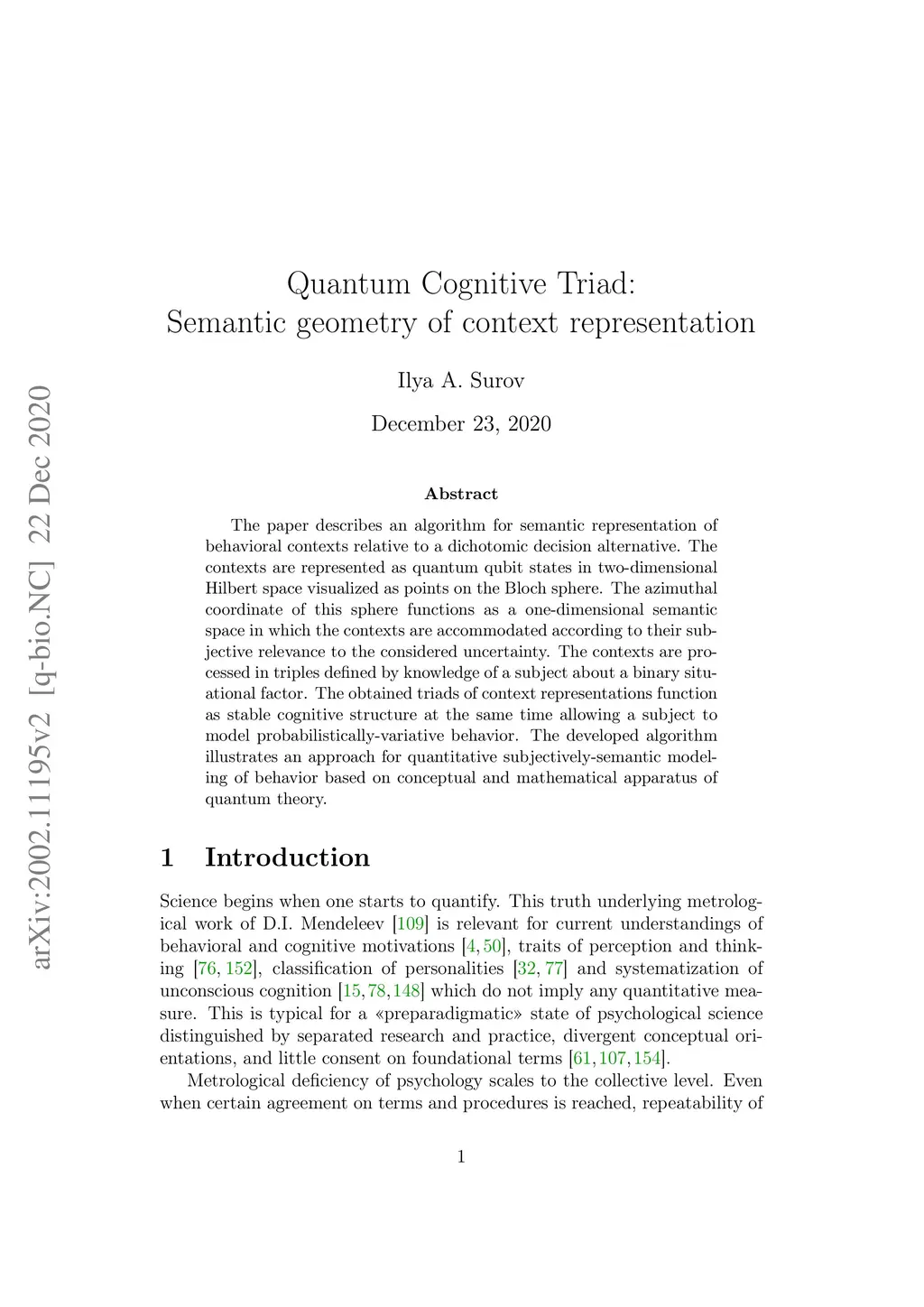The paper describes an algorithm for semantic representation of behavioral contexts relative to a dichotomic decision alternative. The contexts are represented as quantum qubit states in two-dimensional Hilbert space visualized as points on the Bloch sphere. The azimuthal coordinate of this sphere functions as a one-dimensional semantic space in which the contexts are accommodated according to their subjective relevance to the considered uncertainty. The contexts are processed in triples defined by knowledge of a subject about a binary situational factor. The obtained triads of context representations function as stable cognitive structure at the same time allowing a subject to model probabilistically-variative behavior. The developed algorithm illustrates an approach for quantitative subjectively-semantic modeling of behavior based on conceptual and mathematical apparatus of quantum theory.
