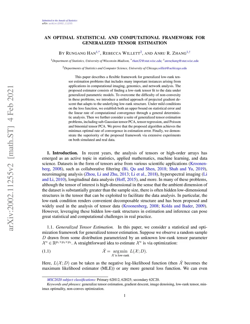 This paper describes a flexible framework for generalized low-rank tensor estimation problems that includes many important instances arising from applications in computational imaging, genomics, and network analysis. The proposed estimator consists of finding a low-rank tensor fit to the data under generalized parametric models. To overcome the difficulty of non-convexity in these problems, we introduce a unified approach of projected gradient descent that adapts to the underlying low-rank structure. Under mild conditions on the loss function, we establish both an upper bound on statistical error and the linear rate of computational convergence through a general deterministic analysis. Then we further consider a suite of generalized tensor estimation problems, including sub-Gaussian tensor PCA, tensor regression, and Poisson and binomial tensor PCA. We prove that the proposed algorithm achieves the minimax optimal rate of convergence in estimation error. Finally, we demonstrate the superiority of the proposed framework via extensive experiments on both simulated and real data.