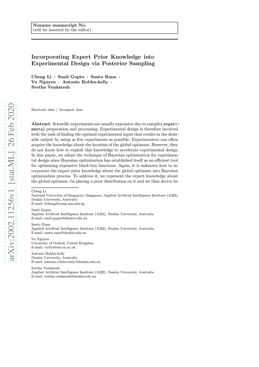Scientific experiments are usually expensive due to complex experimental preparation and processing. Experimental design is therefore involved with the task of finding the optimal experimental input that results in the desirable output by using as few experiments as possible. Experimenters can often acquire the knowledge about the location of the global optimum. However, they do not know how to exploit this knowledge to accelerate experimental design. In this paper, we adopt the technique of Bayesian optimization for experimental design since Bayesian optimization has established itself as an efficient tool for optimizing expensive black-box functions. Again, it is unknown how to incorporate the expert prior knowledge about the global optimum into Bayesian optimization process. To address it, we represent the expert knowledge about the global optimum via placing a prior distribution on it and we then derive its posterior distribution. An efficient Bayesian optimization approach has been proposed via posterior sampling on the posterior distribution of the global optimum. We theoretically analyze the convergence of the proposed algorithm and discuss the robustness of incorporating expert prior. We evaluate the efficiency of our algorithm by optimizing synthetic functions and tuning hyperparameters of classifiers along with a real-world experiment on the synthesis of short polymer fiber. The results clearly demonstrate the advantages of our proposed method.