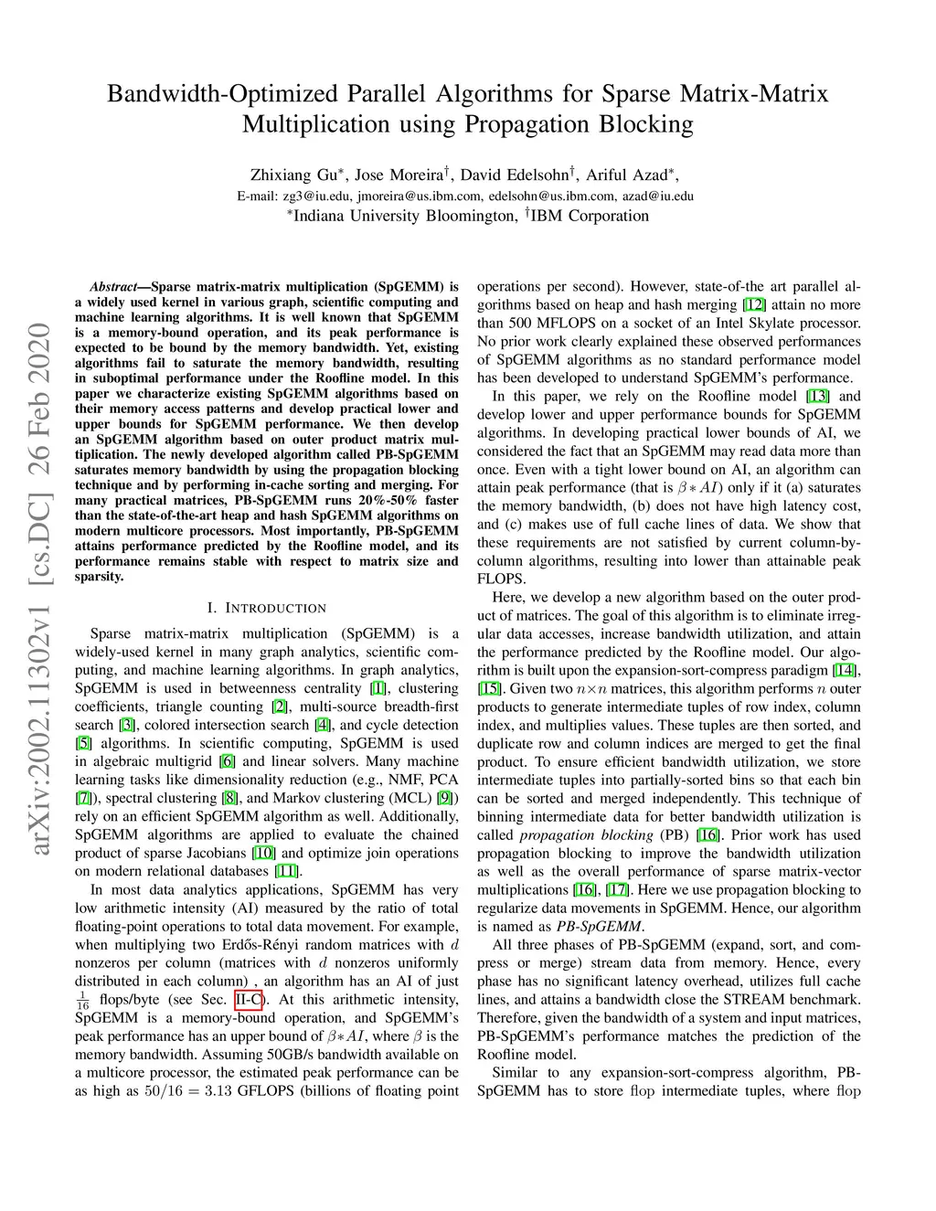 Sparse matrix-matrix multiplication (SpGEMM) is a widely used kernel in various graph, scientific computing and machine learning algorithms. It is well known that SpGEMM is a memory-bound operation, and its peak performance is expected to be bound by the memory bandwidth. Yet, existing algorithms fail to saturate the memory bandwidth, resulting in suboptimal performance under the Roofline model. In this paper we characterize existing SpGEMM algorithms based on their memory access patterns and develop practical lower and upper bounds for SpGEMM performance. We then develop an SpGEMM algorithm based on outer product matrix multiplication. The newly developed algorithm called PB-SpGEMM saturates memory bandwidth by using the propagation blocking technique and by performing in-cache sorting and merging. For many practical matrices, PB-SpGEMM runs 20%-50% faster than the state-of-the-art heap and hash SpGEMM algorithms on modern multicore processors. Most importantly, PB-SpGEMM attains performance predicted by the Roofline model, and its performance remains stable with respect to matrix size and sparsity.