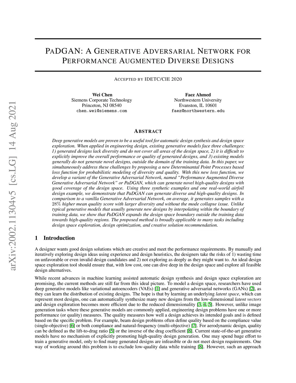 Deep generative models are proven to be a useful tool for automatic design synthesis and design space exploration. When applied in engineering design, existing generative models face three challenges: 1) generated designs lack diversity and do not cover all areas of the design space, 2) it is difficult to explicitly improve the overall performance or quality of generated designs, and 3) existing models generally do not generate novel designs, outside the domain of the training data. In this paper, we simultaneously address these challenges by proposing a new Determinantal Point Processes based loss function for probabilistic modeling of diversity and quality. With this new loss function, we develop a variant of the Generative Adversarial Network, named "Performance Augmented Diverse Generative Adversarial Network" or PaDGAN, which can generate novel high-quality designs with good coverage of the design space. Using three synthetic examples and one real-world airfoil design example, we demonstrate that PaDGAN can generate diverse and high-quality designs. In comparison to a vanilla Generative Adversarial Network, on average, it generates samples with a 28% higher mean quality score with larger diversity and without the mode collapse issue. Unlike typical generative models that usually generate new designs by interpolating within the boundary of training data, we show that PaDGAN expands the design space boundary outside the training data towards high-quality regions. The proposed method is broadly applicable to many tasks including design space exploration, design optimization, and creative solution recommendation.