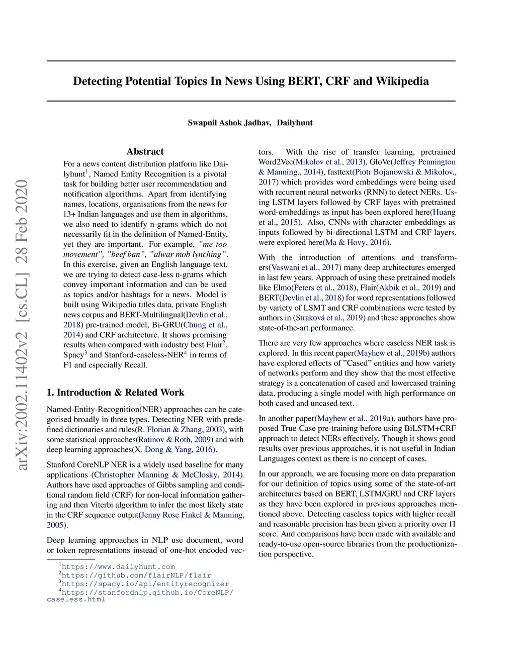 Detecting Potential Topics In News Using BERT, CRF and Wikipedia
