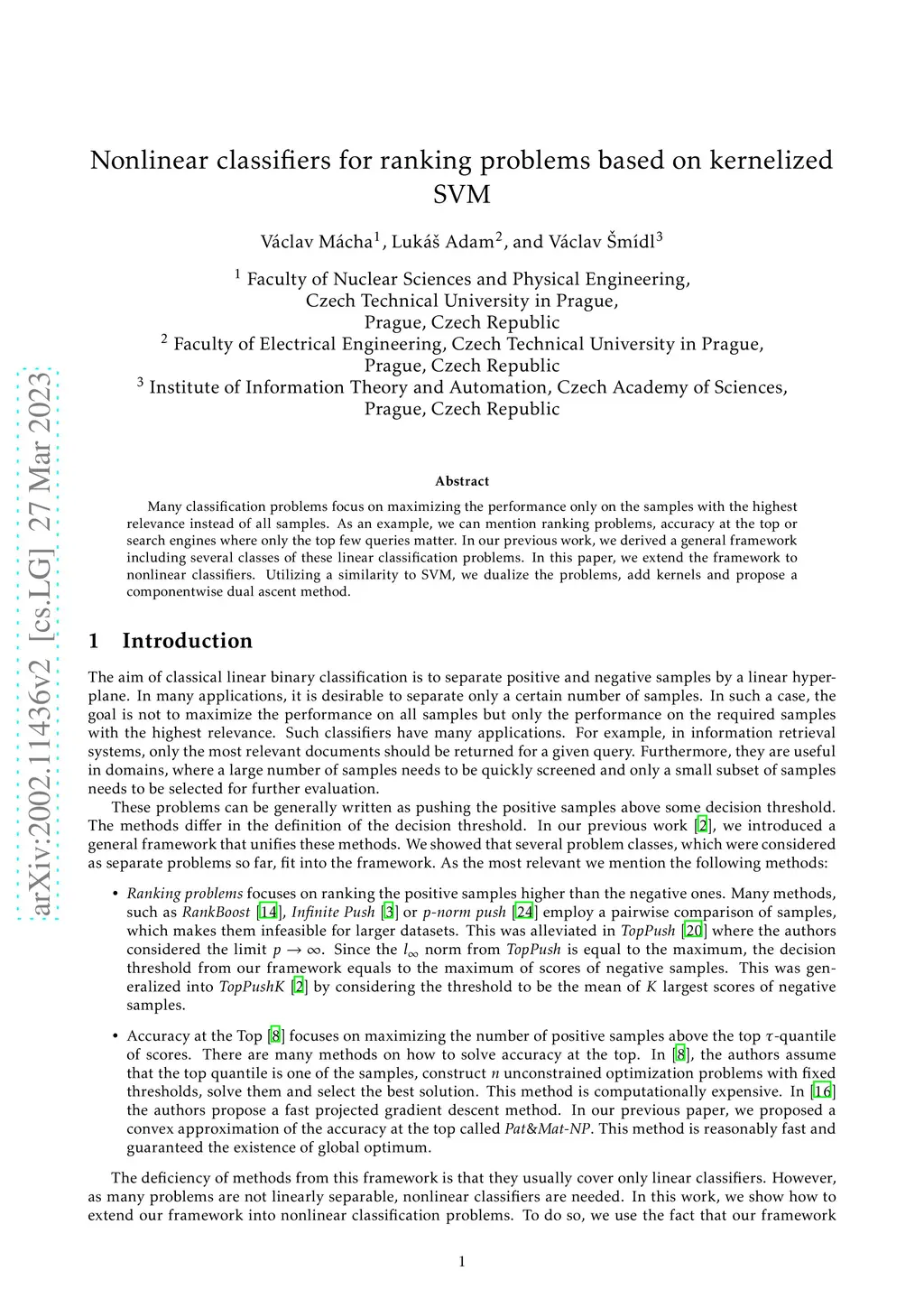 Many classification problems focus on maximizing the performance only on the samples with the highest relevance instead of all samples. As an example, we can mention ranking problems, accuracy at the top or search engines where only the top few queries matter. In our previous work, we derived a general framework including several classes of these linear classification problems. In this paper, we extend the framework to nonlinear classifiers. Utilizing a similarity to SVM, we dualize the problems, add kernels and propose a componentwise dual ascent method. This allows us to perform one iteration in less than 20 milliseconds on relatively large datasets such as FashionMNIST.