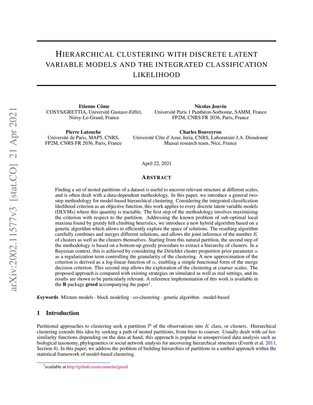 Finding a set of nested partitions of a dataset is useful to uncover relevant structure at different scales, and is often dealt with a data-dependent methodology. In this paper, we introduce a general two-step methodology for model-based hierarchical clustering. Considering the integrated classification likelihood criterion as an objective function, this work applies to every discrete latent variable models (DLVMs) where this quantity is tractable. The first step of the methodology involves maximizing the criterion with respect to the partition. Addressing the known problem of sub-optimal local maxima found by greedy hill climbing heuristics, we introduce a new hybrid algorithm based on a genetic algorithm efficiently exploring the space of solutions. The resulting algorithm carefully combines and merges different solutions, and allows the joint inference of the number of clusters as well as the clusters themselves. Starting from this natural partition, the second step of the methodology is based on a bottom-up greedy procedure to extract a hierarchy of clusters. In a Bayesian context, this is achieved by considering the Dirichlet cluster proportion prior parameter as a regularization term controlling the granularity of the clustering. A new approximation of the criterion is derived as a log-linear function of , enabling a simple functional form of the merge decision criterion. This second step allows the exploration of the clustering at coarser scales. The proposed approach is compared with existing strategies on simulated as well as real settings, and its results are shown to be particularly relevant. A reference implementation of this work is available in the R package greed accompanying the paper.