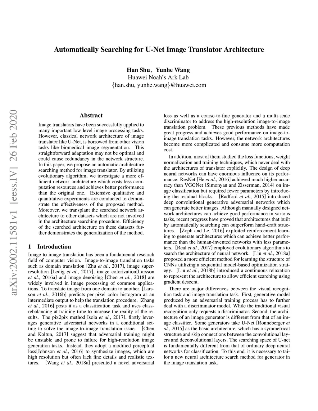 Image translators have been successfully applied to many important low level image processing tasks. However, classical network architecture of image translator like U-Net, is borrowed from other vision tasks like biomedical image segmentation. This straightforward adaptation may not be optimal and could cause redundancy in the network structure. In this paper, we propose an automatic architecture searching method for image translator. By utilizing evolutionary algorithm, we investigate a more efficient network architecture which costs less computation resources and achieves better performance than the original one. Extensive qualitative and quantitative experiments are conducted to demonstrate the effectiveness of the proposed method. Moreover, we transplant the searched network architecture to other datasets which are not involved in the architecture searching procedure. Efficiency of the searched architecture on these datasets further demonstrates the generalization of the method.