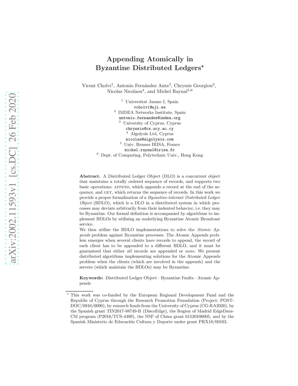 A Distributed Ledger Object (DLO) is a concurrent object that maintains a totally ordered sequence of records, and supports two basic operations: append, which appends a record at the end of the sequence, and get, which returns the sequence of records. In this work we provide a proper formalization of a Byzantine-tolerant Distributed Ledger Object (BDLO), which is a DLO in a distributed system in which processes may deviate arbitrarily from their indented behavior, i.e. they may be Byzantine. Our formal definition is accompanied by algorithms to implement BDLOs by utilizing an underlying Byzantine Atomic Broadcast service. We then utilize the BDLO implementations to solve the Atomic Appends problem against Byzantine processes. The Atomic Appends problem emerges when several clients have records to append, the record of each client has to be appended to a different BDLO, and it must be guaranteed that either all records are appended or none. We present distributed algorithms implementing solutions for the Atomic Appends problem when the clients (which are involved in the appends) and the servers (which maintain the BDLOs) may be Byzantine.