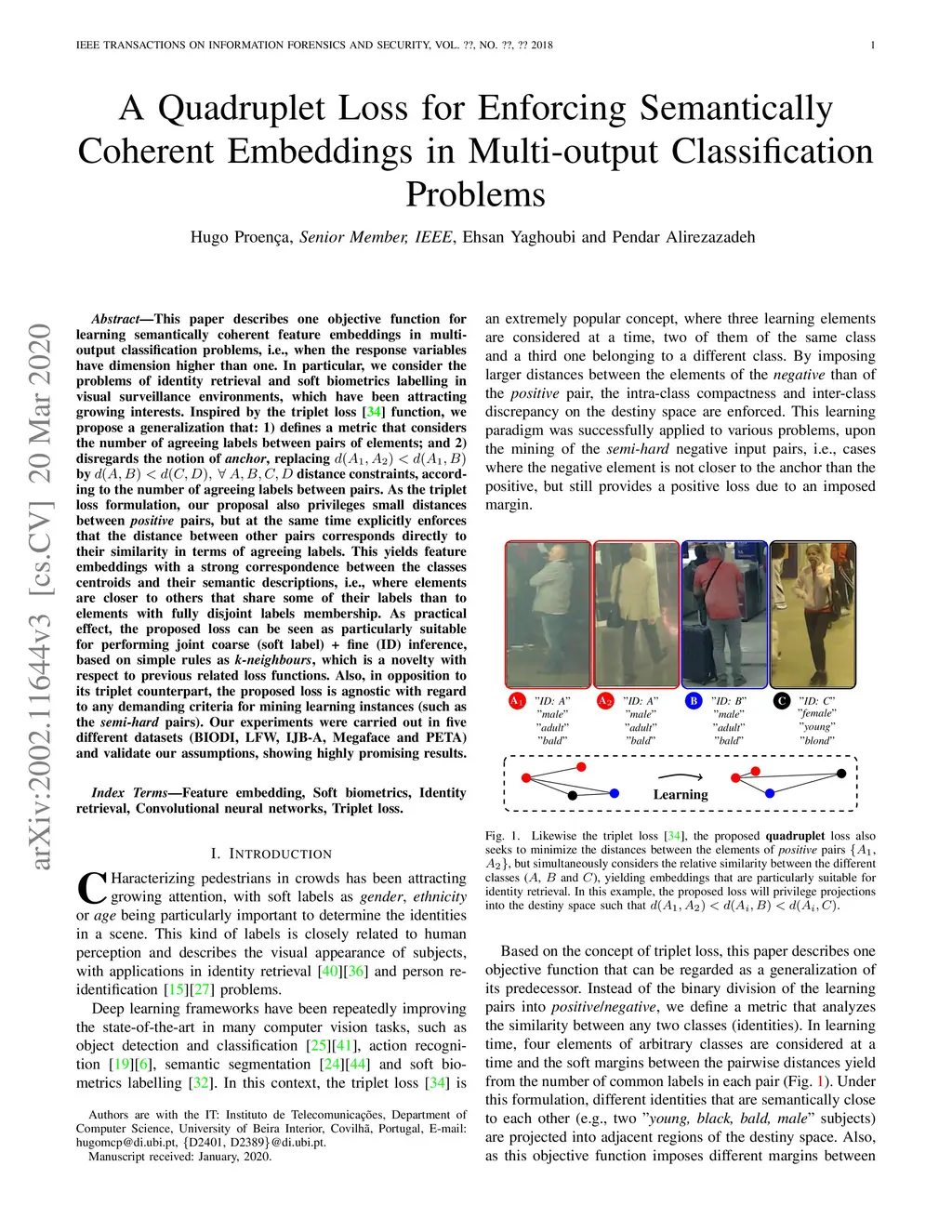 This paper describes one objective function for learning semantically coherent feature embeddings in multi-output classification problems, i.e., when the response variables have dimension higher than one. In particular, we consider the problems of identity retrieval and soft biometrics in visual surveillance environments, which have been attracting growing interests. Inspired by the triplet loss function, we propose a generalization of that concept: a quadruplet loss, that 1) defines a metric that analyzes the number of agreeing labels between pairs of elements; and 2) disregards the notion of anchor, replacing d(A1,A2) < d(A1,B) by d(A,B) < d(C,D) distance constraints, according to such perceived semantic similarity between the elements of each pair. Inherited from the triplet loss formulation, our proposal also privileges small distances between positive pairs, but also explicitly enforces that the distances between negative pairs directly correspond to their similarity in terms of the number of agreeing labels. This typically yields feature embeddings with a strong correspondence between the classes centroids and their semantic descriptions, i.e., where elements that share some of the labels are closer to each other in the destiny space than elements with fully disjoint classes membership. Also, in opposition to its triplet counterpart, the proposed loss is not particularly sensitive to the way learning pairs are mined, being agnostic with regard to demanding criteria for mining learning instances (such as the semi-hard pairs of triplet loss). Our experiments were carried out in four different datasets (BIODI, LFW, Megaface and PETA) and validate our assumptions, showing highly promising results.