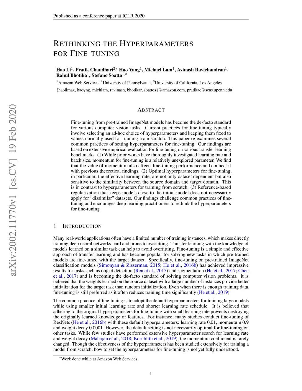 Fine-tuning from pre-trained ImageNet models has become the de-facto standard for various computer vision tasks. Current practices for fine-tuning typically involve selecting an ad-hoc choice of hyperparameters and keeping them fixed to values normally used for training from scratch. This paper re-examines several common practices of setting hyperparameters for fine-tuning. Our findings are based on extensive empirical evaluation for fine-tuning on various transfer learning benchmarks. (1) While prior works have thoroughly investigated learning rate and batch size, momentum for fine-tuning is a relatively unexplored parameter. We find that the value of momentum also affects fine-tuning performance and connect it with previous theoretical findings. (2) Optimal hyperparameters for fine-tuning, in particular, the effective learning rate, are not only dataset dependent but also sensitive to the similarity between the source domain and target domain. This is in contrast to hyperparameters for training from scratch. (3) Reference-based regularization that keeps models close to the initial model does not necessarily apply for "dissimilar" datasets. Our findings challenge common practices of fine-tuning and encourages deep learning practitioners to rethink the hyperparameters for fine-tuning.