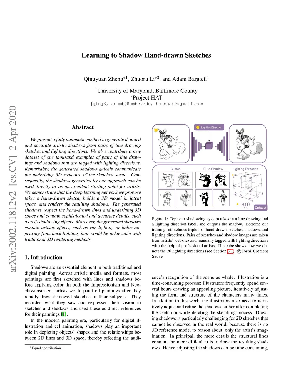 We present a fully automatic method to generate detailed and accurate artistic shadows from pairs of line drawing sketches and lighting directions. We also contribute a new dataset of one thousand examples of pairs of line drawings and shadows that are tagged with lighting directions. Remarkably, the generated shadows quickly communicate the underlying 3D structure of the sketched scene. Consequently, the shadows generated by our approach can be used directly or as an excellent starting point for artists. We demonstrate that the deep learning network we propose takes a hand-drawn sketch, builds a 3D model in latent space, and renders the resulting shadows. The generated shadows respect the hand-drawn lines and underlying 3D space and contain sophisticated and accurate details, such as self-shadowing effects. Moreover, the generated shadows contain artistic effects, such as rim lighting or halos appearing from back lighting, that would be achievable with traditional 3D rendering methods.