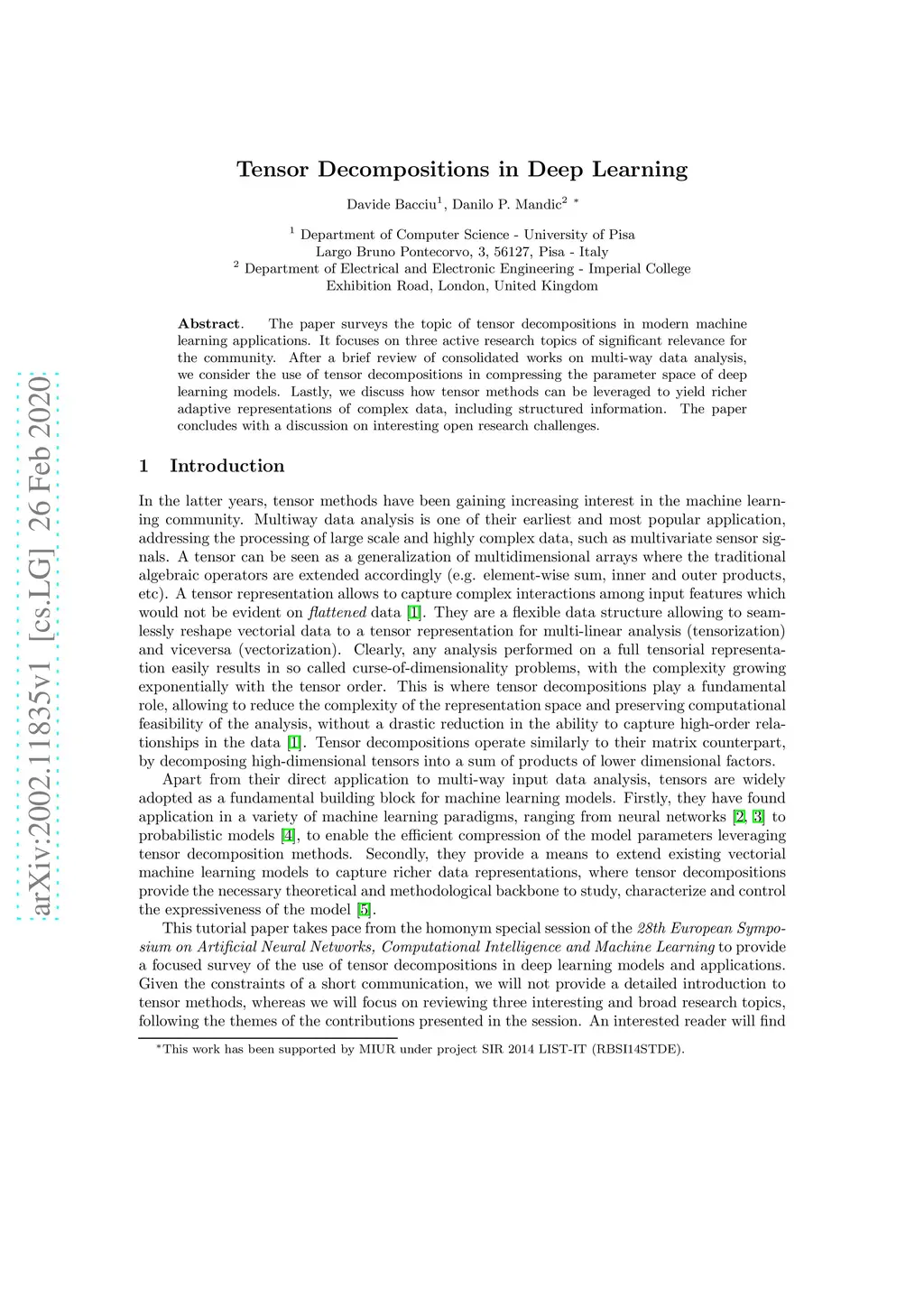 The paper surveys the topic of tensor decompositions in modern machine learning applications. It focuses on three active research topics of significant relevance for the community. After a brief review of consolidated works on multi-way data analysis, we consider the use of tensor decompositions in compressing the parameter space of deep learning models. Lastly, we discuss how tensor methods can be leveraged to yield richer adaptive representations of complex data, including structured information. The paper concludes with a discussion on interesting open research challenges.