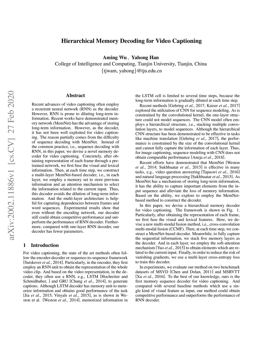 Recent advances of video captioning often employ a recurrent neural network (RNN) as the decoder. However, RNN is prone to diluting long-term information. Recent works have demonstrated memory network (MemNet) has the advantage of storing long-term information. However, as the decoder, it has not been well exploited for video captioning. The reason partially comes from the difficulty of sequence decoding with MemNet. Instead of the common practice, i.e., sequence decoding with RNN, in this paper, we devise a novel memory decoder for video captioning. Concretely, after obtaining representation of each frame through a pre-trained network, we first fuse the visual and lexical information. Then, at each time step, we construct a multi-layer MemNet-based decoder, i.e., in each layer, we employ a memory set to store previous information and an attention mechanism to select the information related to the current input. Thus, this decoder avoids the dilution of long-term information. And the multi-layer architecture is helpful for capturing dependencies between frames and word sequences. Experimental results show that even without the encoding network, our decoder still could obtain competitive performance and outperform the performance of RNN decoder. Furthermore, compared with one-layer RNN decoder, our decoder has fewer parameters.