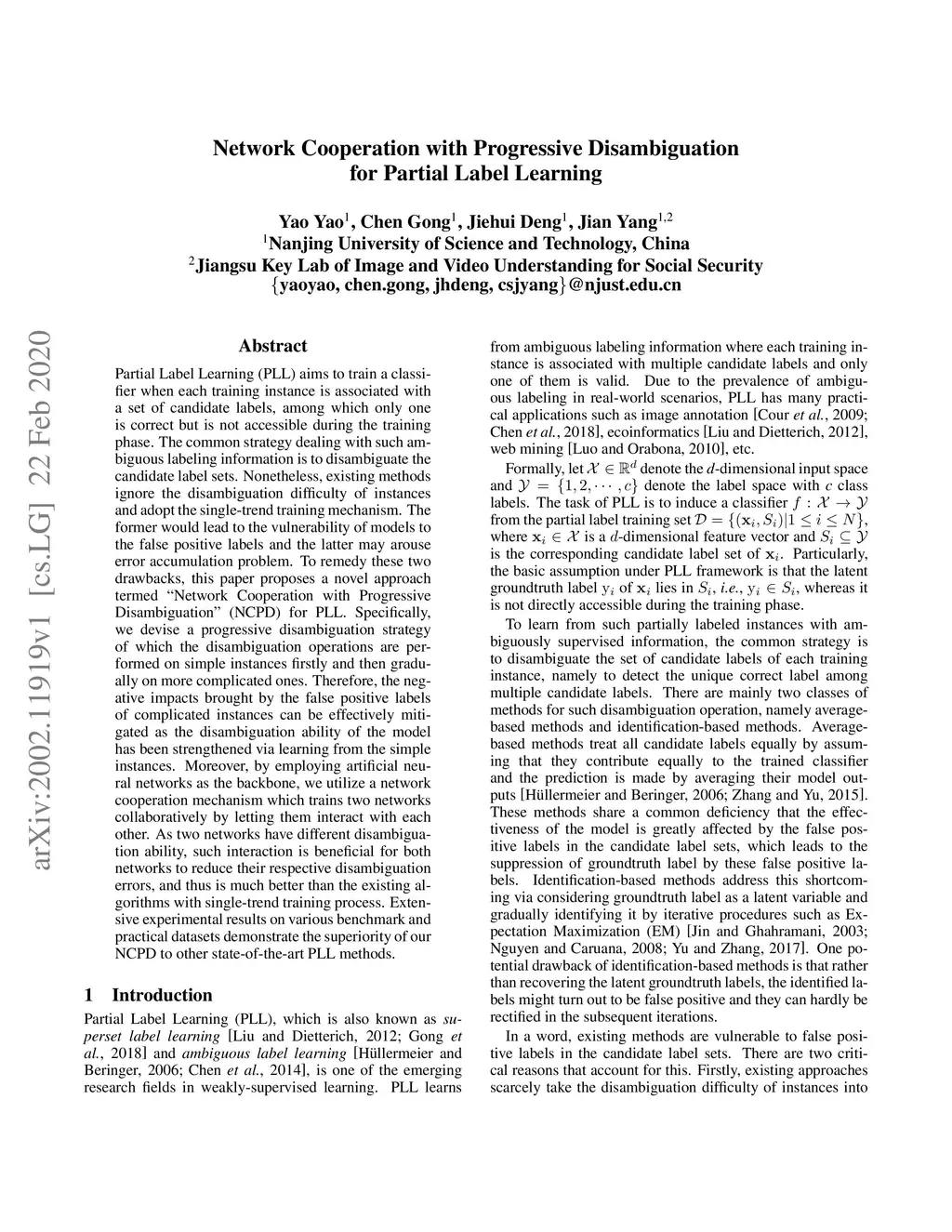 Network Cooperation with Progressive Disambiguation for Partial Label