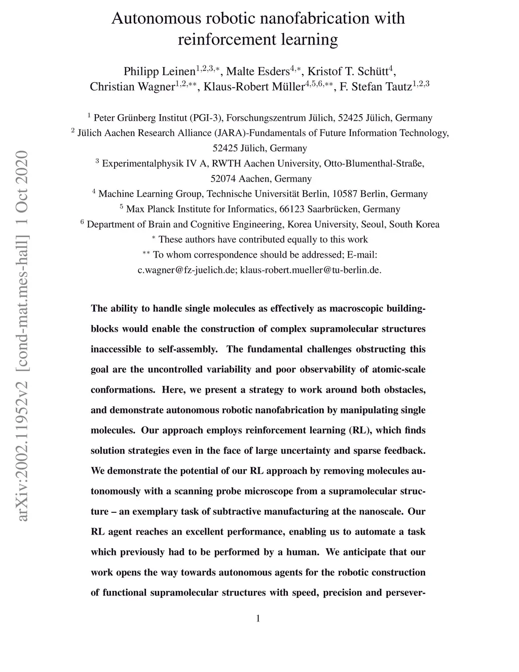 Autonomous robotic nanofabrication with reinforcement learning