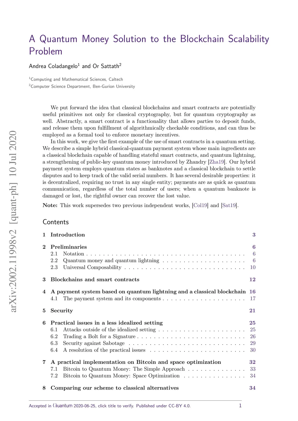 We put forward the idea that classical blockchains and smart contracts are potentially useful primitives not only for classical cryptography, but for quantum cryptography as well. Abstractly, a smart contract is a functionality that allows parties to deposit funds, and release them upon fulfillment of algorithmically checkable conditions, and can thus be employed as a formal tool to enforce monetary incentives. In this work, we give the first example of the use of smart contracts in a quantum setting. We describe a simple hybrid classical-quantum payment system whose main ingredients are a classical blockchain capable of handling stateful smart contracts, and quantum lightning, a strengthening of public-key quantum money introduced by Zhandry (Eurocrypt'19). Our hybrid payment system employs quantum states as banknotes and a classical blockchain to settle disputes and to keep track of the valid serial numbers. It has several desirable properties: it is decentralized, requiring no trust in any single entity; payments are as quick as quantum communication, regardless of the total number of users; when a quantum banknote is damaged or lost, the rightful owner can recover the lost value.