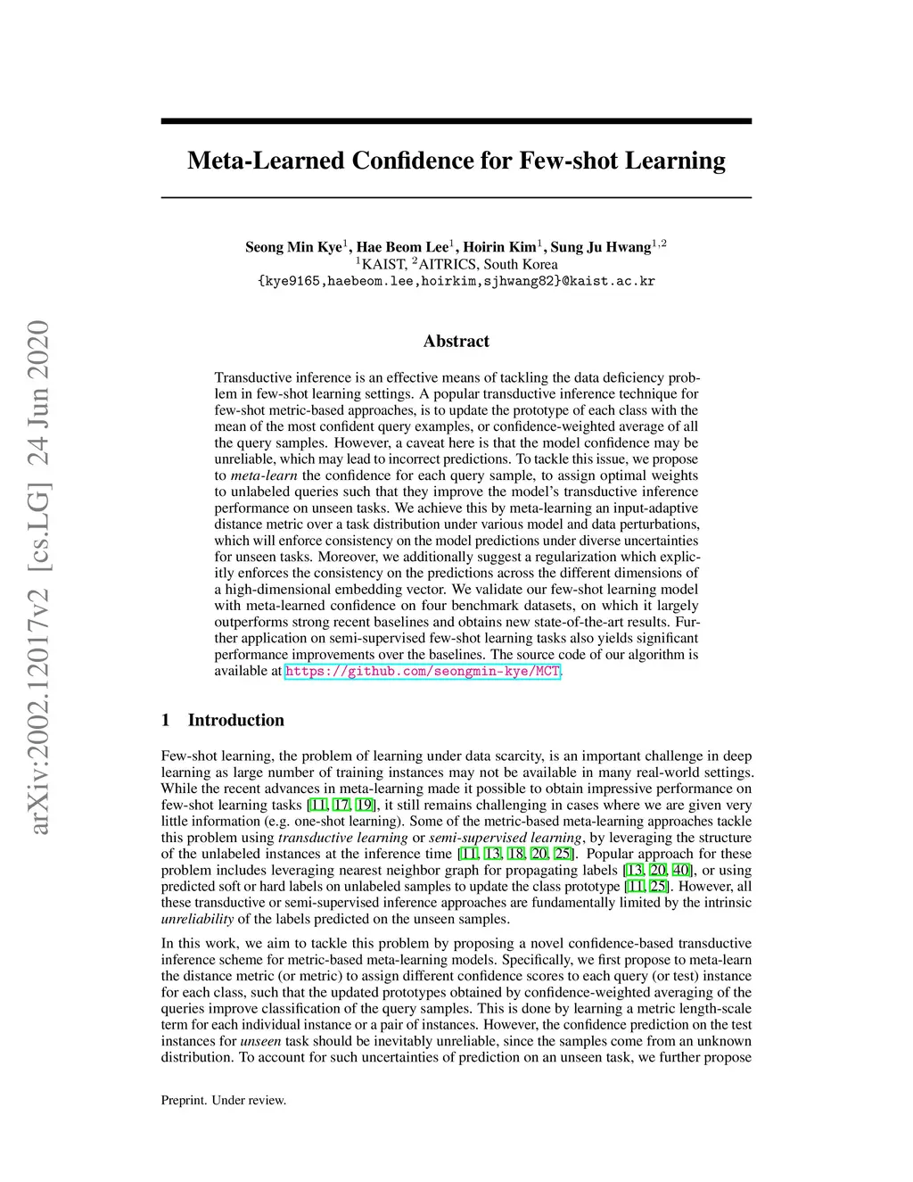 Transductive inference is an effective means of tackling the data deficiency problem in few-shot learning settings. A popular transductive inference technique for few-shot metric-based approaches, is to update the prototype of each class with the mean of the most confident query examples, or confidence-weighted average of all the query samples. However, a caveat here is that the model confidence may be unreliable, which may lead to incorrect predictions. To tackle this issue, we propose to meta-learn the confidence for each query sample, to assign optimal weights to unlabeled queries such that they improve the model's transductive inference performance on unseen tasks. We achieve this by meta-learning an input-adaptive distance metric over a task distribution under various model and data perturbations, which will enforce consistency on the model predictions under diverse uncertainties for unseen tasks. Moreover, we additionally suggest a regularization which explicitly enforces the consistency on the predictions across the different dimensions of a high-dimensional embedding vector. We validate our few-shot learning model with meta-learned confidence on four benchmark datasets, on which it largely outperforms strong recent baselines and obtains new state-of-the-art results. Further application on semi-supervised few-shot learning tasks also yields significant performance improvements over the baselines. The source code of our algorithm is available at https://github.com/seongmin-kye/MCT.