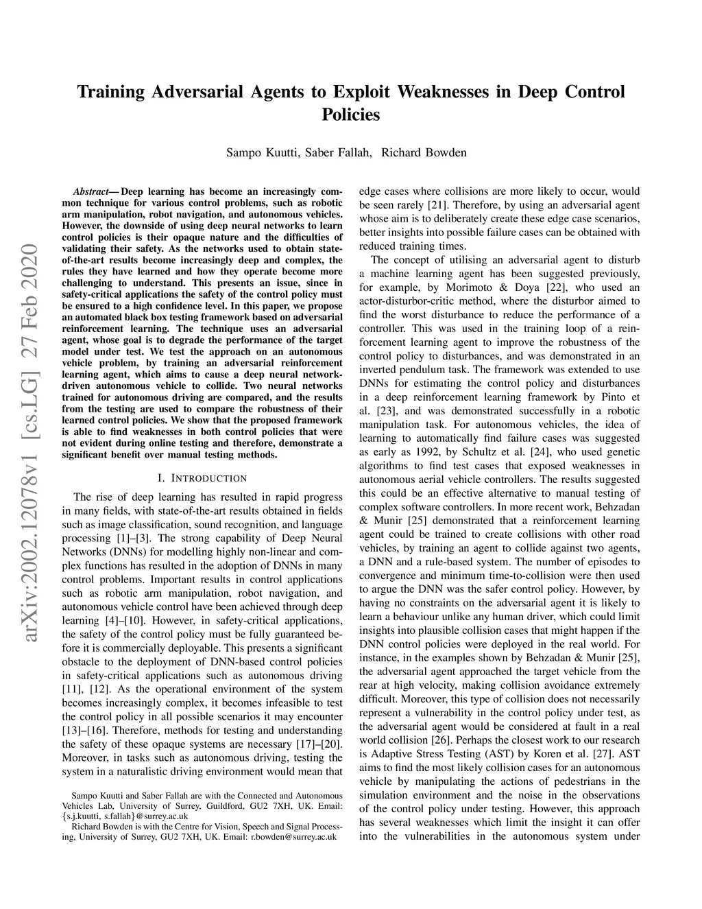 Deep learning has become an increasingly common technique for various control problems, such as robotic arm manipulation, robot navigation, and autonomous vehicles. However, the downside of using deep neural networks to learn control policies is their opaque nature and the difficulties of validating their safety. As the networks used to obtain state-of-the-art results become increasingly deep and complex, the rules they have learned and how they operate become more challenging to understand. This presents an issue, since in safety-critical applications the safety of the control policy must be ensured to a high confidence level. In this paper, we propose an automated black box testing framework based on adversarial reinforcement learning. The technique uses an adversarial agent, whose goal is to degrade the performance of the target model under test. We test the approach on an autonomous vehicle problem, by training an adversarial reinforcement learning agent, which aims to cause a deep neural network-driven autonomous vehicle to collide. Two neural networks trained for autonomous driving are compared, and the results from the testing are used to compare the robustness of their learned control policies. We show that the proposed framework is able to find weaknesses in both control policies that were not evident during online testing and therefore, demonstrate a significant benefit over manual testing methods.