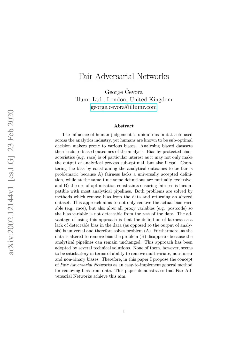 The influence of human judgement is ubiquitous in datasets used across the analytics industry, yet humans are known to be sub-optimal decision makers prone to various biases. Analysing biased datasets then leads to biased outcomes of the analysis. Bias by protected characteristics (e.g. race) is of particular interest as it may not only make the output of analytical process sub-optimal, but also illegal. Countering the bias by constraining the analytical outcomes to be fair is problematic because A) fairness lacks a universally accepted definition, while at the same time some definitions are mutually exclusive, and B) the use of optimisation constraints ensuring fairness is incompatible with most analytical pipelines. Both problems are solved by methods which remove bias from the data and returning an altered dataset. This approach aims to not only remove the actual bias variable (e.g. race), but also alter all proxy variables (e.g. postcode) so the bias variable is not detectable from the rest of the data. The advantage of using this approach is that the definition of fairness as a lack of detectable bias in the data (as opposed to the output of analysis) is universal and therefore solves problem (A). Furthermore, as the data is altered to remove bias the problem (B) disappears because the analytical pipelines can remain unchanged. This approach has been adopted by several technical solutions. None of them, however, seems to be satisfactory in terms of ability to remove multivariate, non-linear and non-binary biases. Therefore, in this paper I propose the concept of Fair Adversarial Networks as an easy-to-implement general method for removing bias from data. This paper demonstrates that Fair Adversarial Networks achieve this aim.