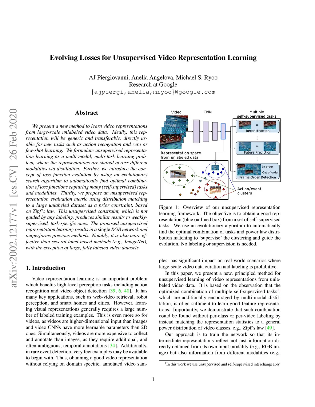 We present a new method to learn video representations from large-scale unlabeled video data. Ideally, this representation will be generic and transferable, directly usable for new tasks such as action recognition and zero or few-shot learning. We formulate unsupervised representation learning as a multi-modal, multi-task learning problem, where the representations are shared across different modalities via distillation. Further, we introduce the concept of loss function evolution by using an evolutionary search algorithm to automatically find optimal combination of loss functions capturing many (self-supervised) tasks and modalities. Thirdly, we propose an unsupervised representation evaluation metric using distribution matching to a large unlabeled dataset as a prior constraint, based on Zipf's law. This unsupervised constraint, which is not guided by any labeling, produces similar results to weakly-supervised, task-specific ones. The proposed unsupervised representation learning results in a single RGB network and outperforms previous methods. Notably, it is also more effective than several label-based methods (e.g., ImageNet), with the exception of large, fully labeled video datasets.