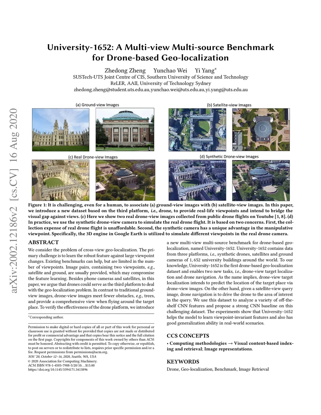 We consider the problem of cross-view geo-localization. The primary challenge of this task is to learn the robust feature against large viewpoint changes. Existing benchmarks can help, but are limited in the number of viewpoints. Image pairs, containing two viewpoints, e.g., satellite and ground, are usually provided, which may compromise the feature learning. Besides phone cameras and satellites, in this paper, we argue that drones could serve as the third platform to deal with the geo-localization problem. In contrast to the traditional ground-view images, drone-view images meet fewer obstacles, e.g., trees, and could provide a comprehensive view when flying around the target place. To verify the effectiveness of the drone platform, we introduce a new multi-view multi-source benchmark for drone-based geo-localization, named University-1652. University-1652 contains data from three platforms, i.e., synthetic drones, satellites and ground cameras of 1,652 university buildings around the world. To our knowledge, University-1652 is the first drone-based geo-localization dataset and enables two new tasks, i.e., drone-view target localization and drone navigation. As the name implies, drone-view target localization intends to predict the location of the target place via drone-view images. On the other hand, given a satellite-view query image, drone navigation is to drive the drone to the area of interest in the query. We use this dataset to analyze a variety of off-the-shelf CNN features and propose a strong CNN baseline on this challenging dataset. The experiments show that University-1652 helps the model to learn the viewpoint-invariant features and also has good generalization ability in the real-world scenario.