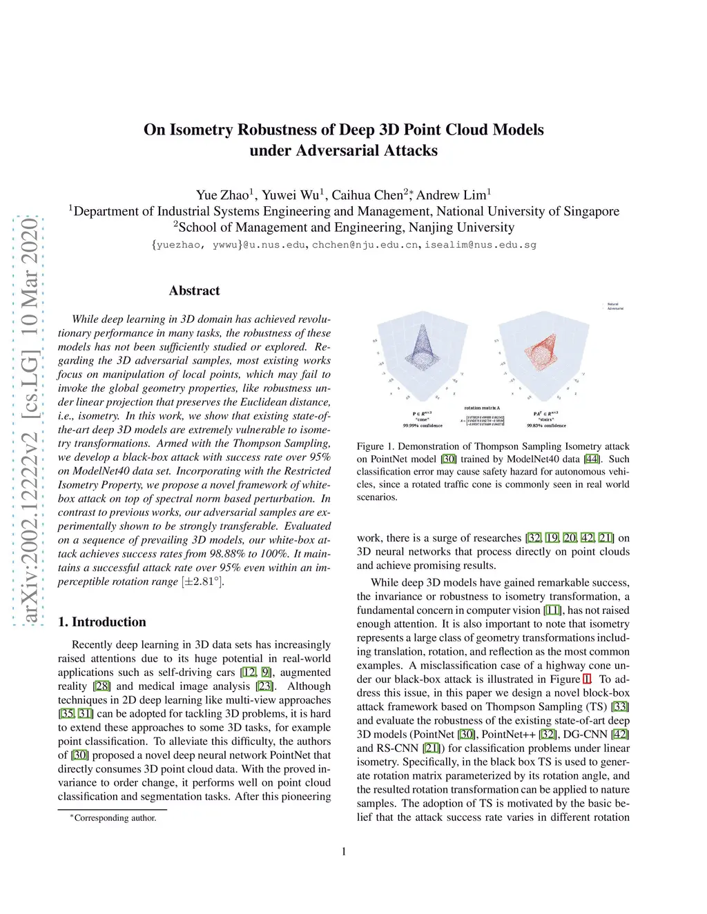 While deep learning in 3D domain has achieved revolutionary performance in many tasks, the robustness of these models has not been sufficiently studied or explored. Regarding the 3D adversarial samples, most existing works focus on manipulation of local points, which may fail to invoke the global geometry properties, like robustness under linear projection that preserves the Euclidean distance, i.e., isometry. In this work, we show that existing state-of-the-art deep 3D models are extremely vulnerable to isometry transformations. Armed with the Thompson Sampling, we develop a black-box attack with success rate over 95% on ModelNet40 data set. Incorporating with the Restricted Isometry Property, we propose a novel framework of white-box attack on top of spectral norm based perturbation. In contrast to previous works, our adversarial samples are experimentally shown to be strongly transferable. Evaluated on a sequence of prevailing 3D models, our white-box attack achieves success rates from 98.88% to 100%. It maintains a successful attack rate over 95% even within an imperceptible rotation range .