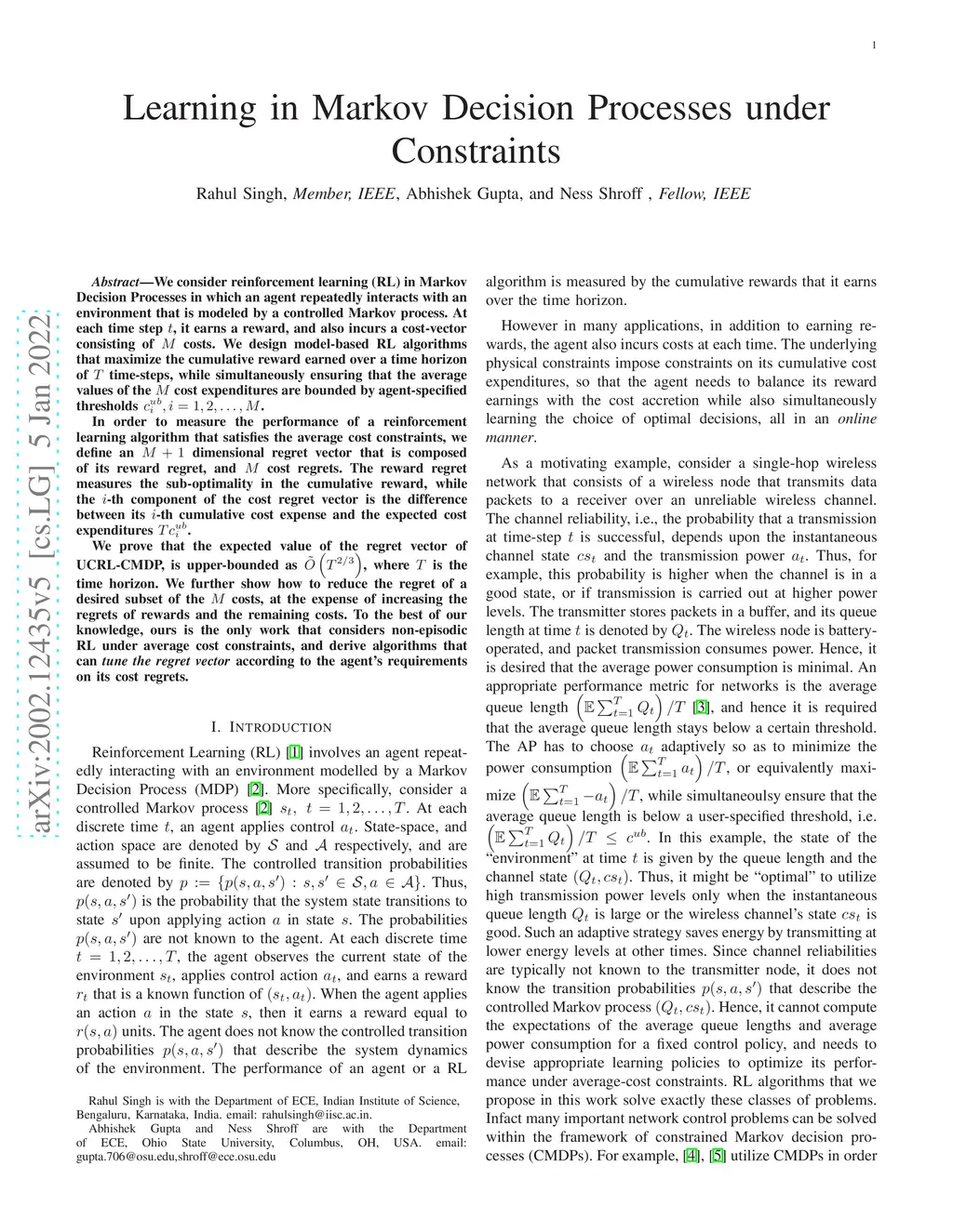 We consider reinforcement learning (RL) in Markov Decision Processes in which an agent repeatedly interacts with an environment that is modeled by a controlled Markov process. At each time step , it earns a reward, and also incurs a cost-vector consisting of costs. We design model-based RL algorithms that maximize the cumulative reward earned over a time horizon of time-steps, while simultaneously ensuring that the average values of the cost expenditures are bounded by agent-specified thresholds . In order to measure the performance of a reinforcement learning algorithm that satisfies the average cost constraints, we define an dimensional regret vector that is composed of its reward regret, and cost regrets. The reward regret measures the sub-optimality in the cumulative reward, while the -th component of the cost regret vector is the difference between its -th cumulative cost expense and the expected cost expenditures . We prove that the expected value of the regret vector of UCRL-CMDP, is upper-bounded as , where is the time horizon. We further show how to reduce the regret of a desired subset of the costs, at the expense of increasing the regrets of rewards and the remaining costs. To the best of our knowledge, ours is the only work that considers non-episodic RL under average cost constraints, and derive algorithms that can~\emph{tune the regret vector} according to the agent's requirements on its cost regrets.