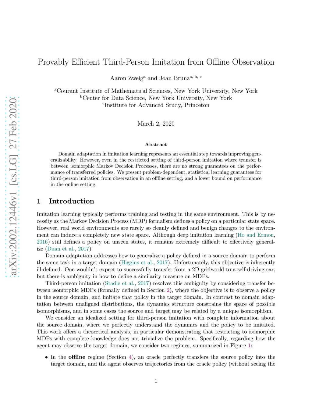 Domain adaptation in imitation learning represents an essential step towards improving generalizability. However, even in the restricted setting of third-person imitation where transfer is between isomorphic Markov Decision Processes, there are no strong guarantees on the performance of transferred policies. We present problem-dependent, statistical learning guarantees for third-person imitation from observation in an offline setting, and a lower bound on performance in the online setting.