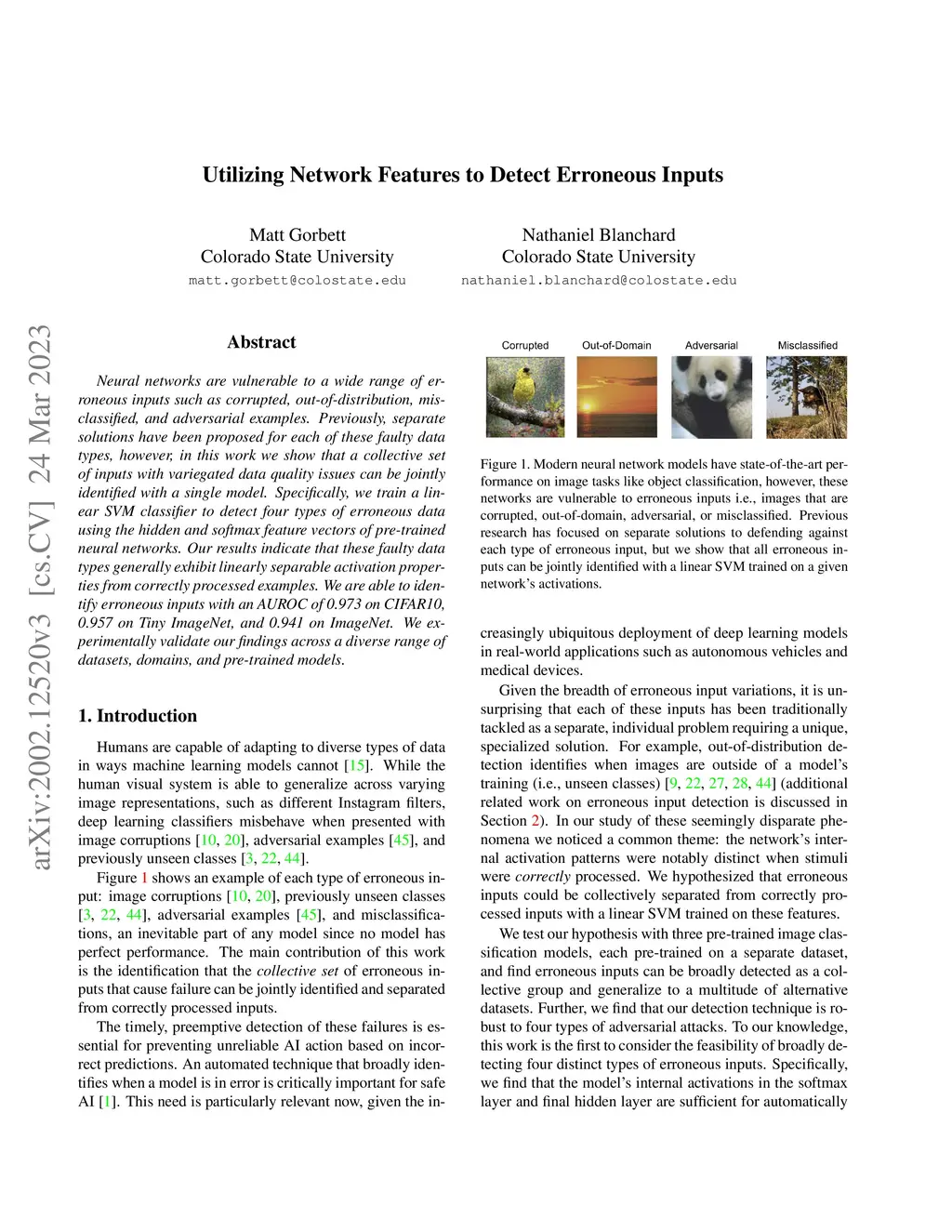 Neural networks are vulnerable to a wide range of erroneous inputs such as adversarial, corrupted, out-of-distribution, and misclassified examples. In this work, we train a linear SVM classifier to detect these four types of erroneous data using hidden and softmax feature vectors of pre-trained neural networks. Our results indicate that these faulty data types generally exhibit linearly separable activation properties from correct examples, giving us the ability to reject bad inputs with no extra training or overhead. We experimentally validate our findings across a diverse range of datasets, domains, pre-trained models, and adversarial attacks.
