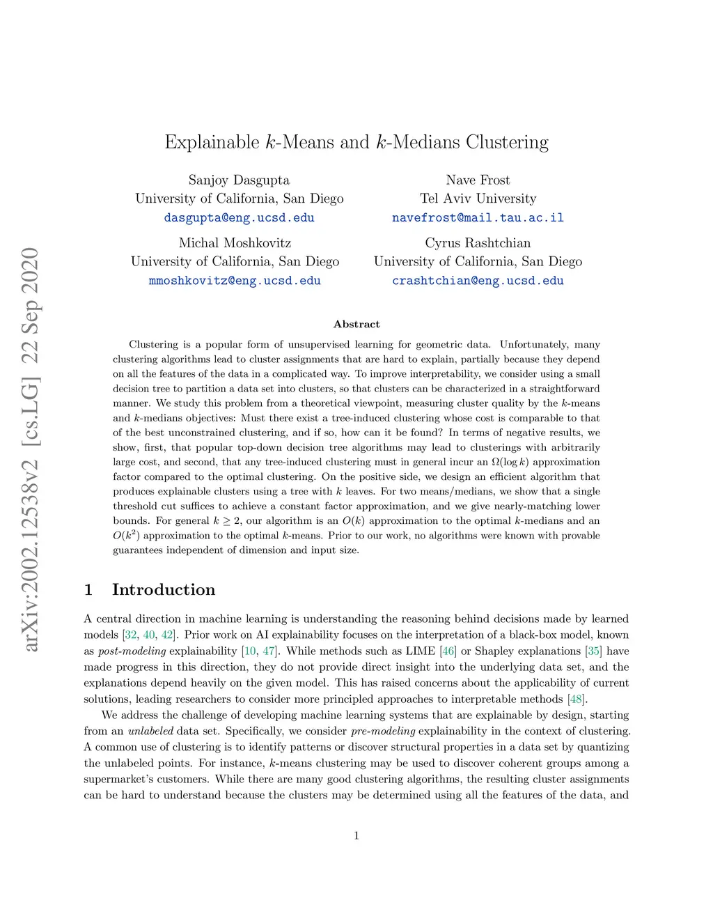 Clustering is a popular form of unsupervised learning for geometric data. Unfortunately, many clustering algorithms lead to cluster assignments that are hard to explain, partially because they depend on all the features of the data in a complicated way. To improve interpretability, we consider using a small decision tree to partition a data set into clusters, so that clusters can be characterized in a straightforward manner. We study this problem from a theoretical viewpoint, measuring cluster quality by the -means and -medians objectives: Must there exist a tree-induced clustering whose cost is comparable to that of the best unconstrained clustering, and if so, how can it be found? In terms of negative results, we show, first, that popular top-down decision tree algorithms may lead to clusterings with arbitrarily large cost, and second, that any tree-induced clustering must in general incur an approximation factor compared to the optimal clustering. On the positive side, we design an efficient algorithm that produces explainable clusters using a tree with leaves. For two means/medians, we show that a single threshold cut suffices to achieve a constant factor approximation, and we give nearly-matching lower bounds. For general , our algorithm is an approximation to the optimal -medians and an approximation to the optimal -means. Prior to our work, no algorithms were known with provable guarantees independent of dimension and input size.